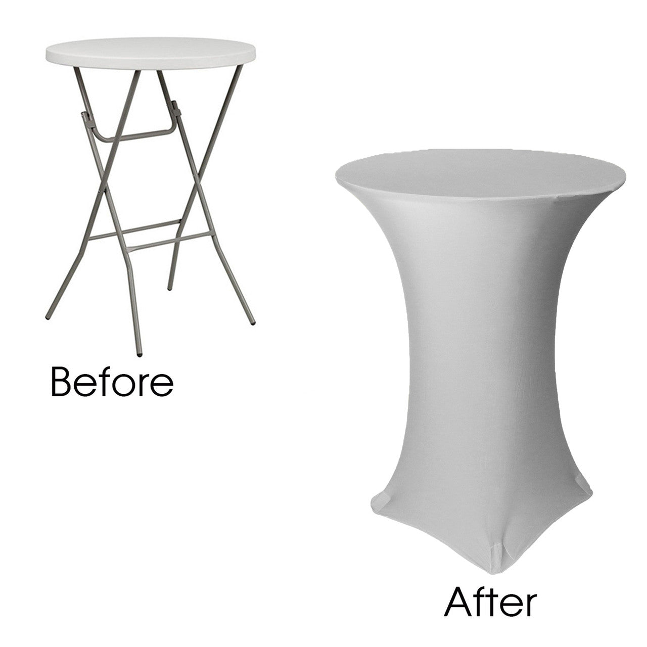 Our durable spandex chair covers fit standard 36"x42" Highboy Tables (36" Round x 42" Tall w/ 4 Leg Base). They're made from high quality spandex with a 4-way stretch so they're easy to put on and made to last. They're also made with durable elastic foot pockets which help secure the cover in place, ensure a great fit, and help prevent damage and excess wear and tear. These covers are a perfect way to improve the look of your chair covers and ideal for rental companies, banquet halls, hotels, various venues and special events.