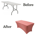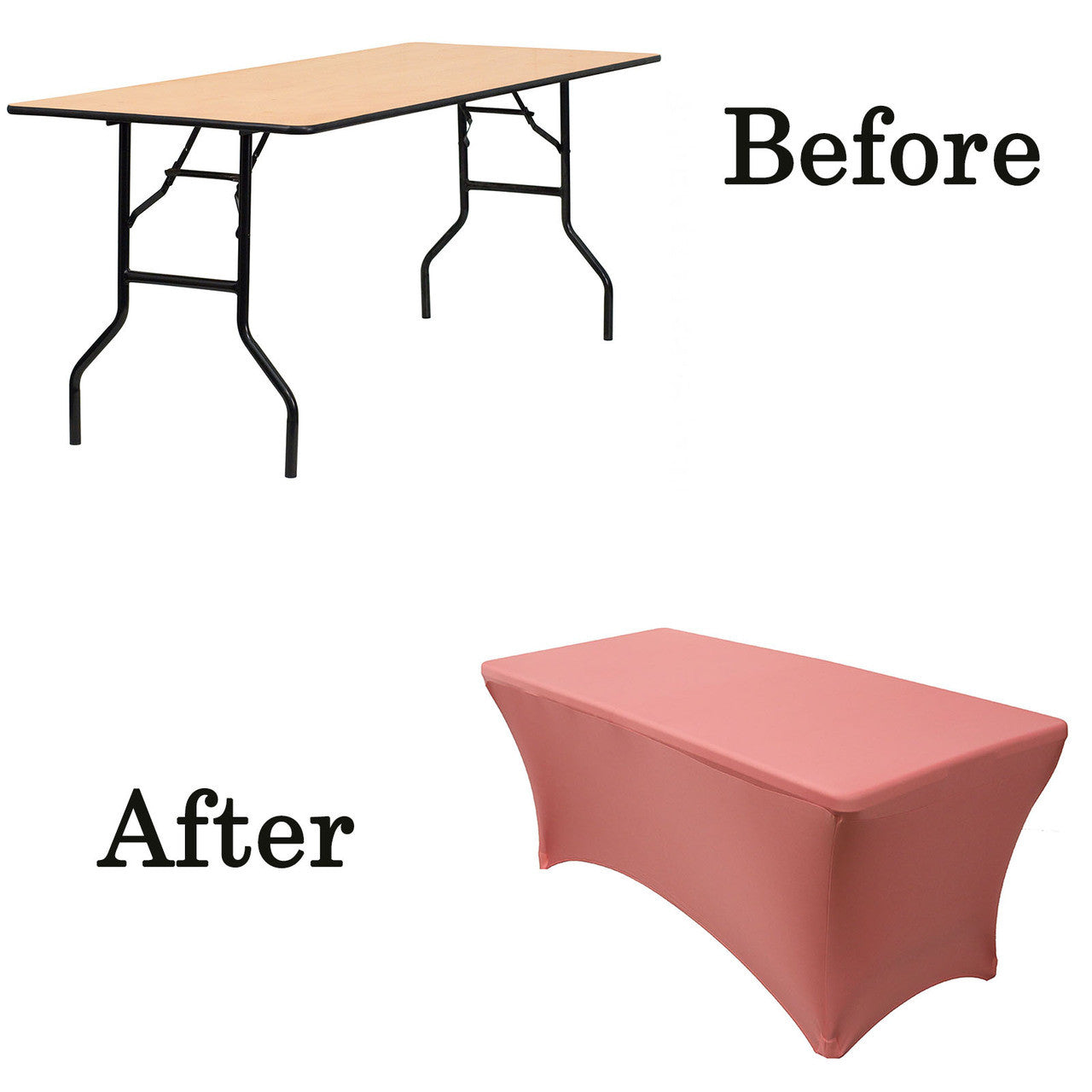 Our durable spandex chair covers fit standard 8' Banquet Tables (8' Length x 30" Depth x 30" Tall). They're made from high quality spandex with a 4-way stretch so they're easy to put on and made to last. They're also made with durable elastic foot pockets which help secure the cover in place, ensure a great fit, and help prevent damage and excess wear and tear. These covers are a perfect way to improve the look of your chair covers and ideal for rental companies, banquet halls, hotels, various venues and special events.