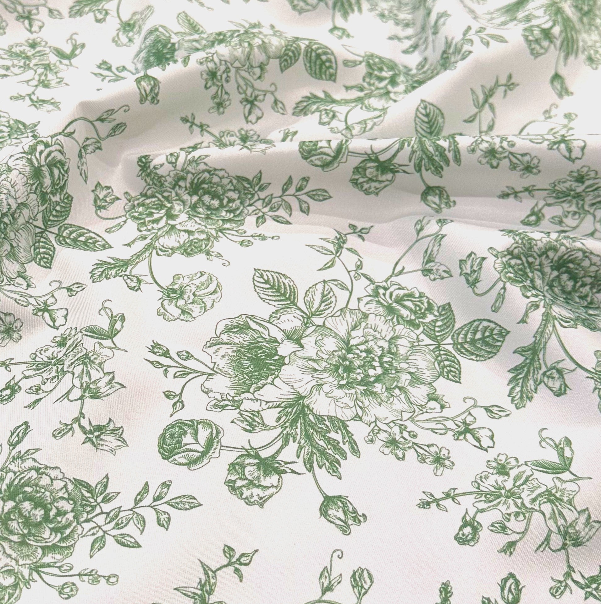 Fabric Collection: This fabric has a polyester base with our "French Toile" print in our Willow Green color with a White background.