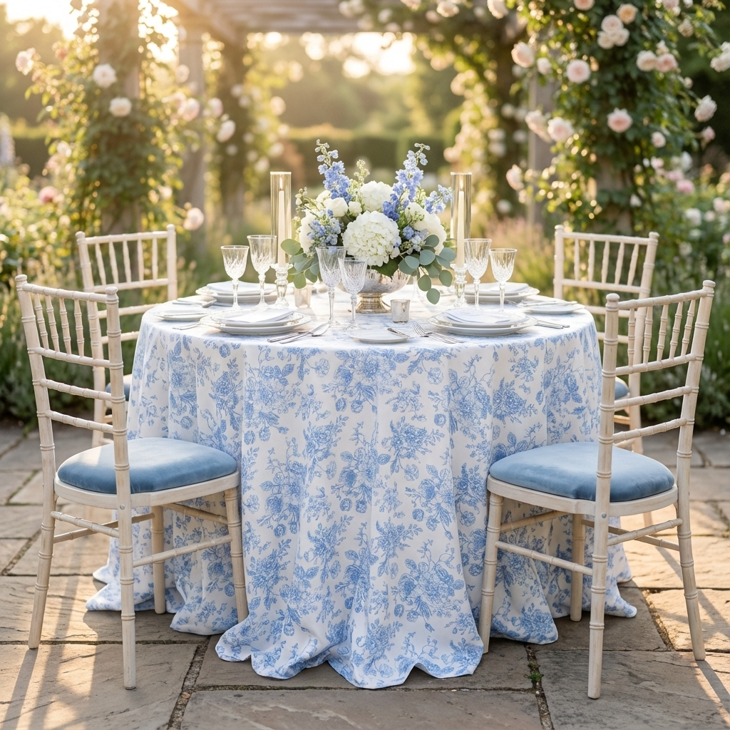 French Toile (Poly Print) Table Linen in Lt Blue