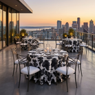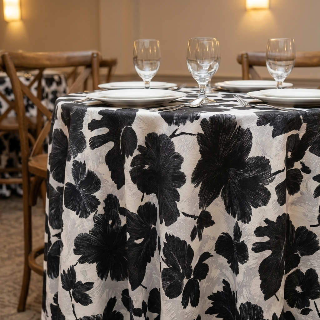 Fabric Collection: Elevate your event décor with our Mono Leaf print, a bold black-and-white floral fabric on high-quality polyester with a slubbed linen look. Perfect for tablecloths, runners, napkins, and drapes, it’s durable, wrinkle-resistant, and ideal for weddings, hotels, and event rentals.