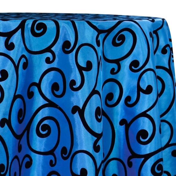 Swirl Flocking Taffeta Table Linen in Black on Royal