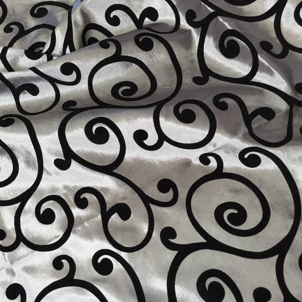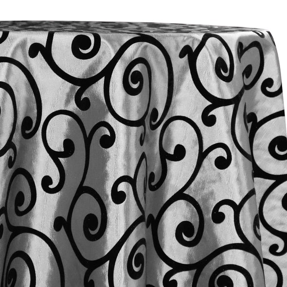 Swirl Flocking Taffeta Table Linen in Black on Silver