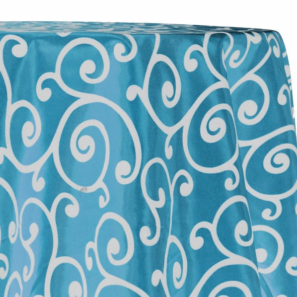 Swirl Flocking Taffeta Table Linen in Silver on Turquoise