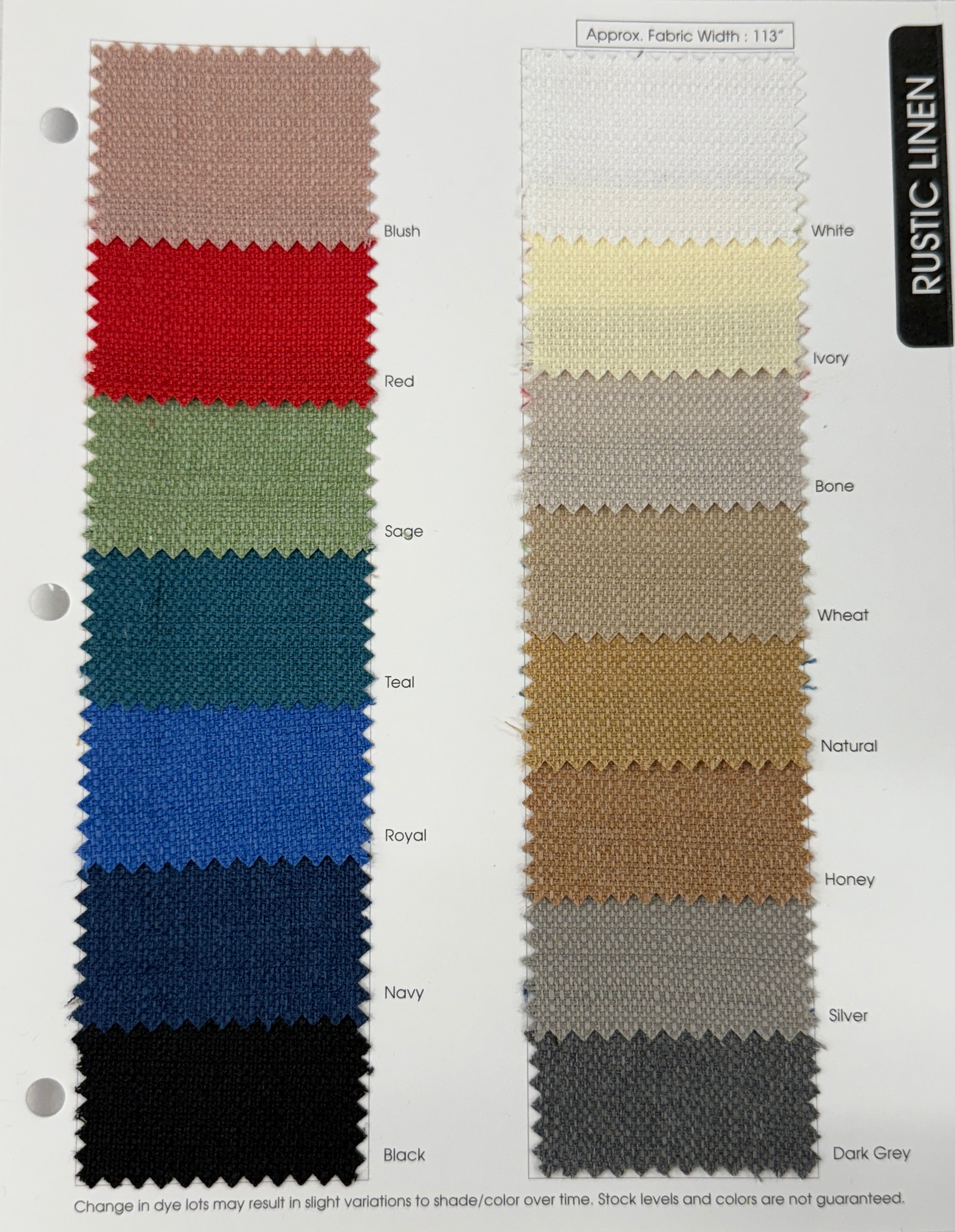 COLOR POLICY: All fabric shades are subject to dye lot variations. Orders for the same item placed at various times may differ in shade due to changes in dye lots. If you are unsure about a color, please order a swatch to confirm the recent dye lot matches with your existing inventory.