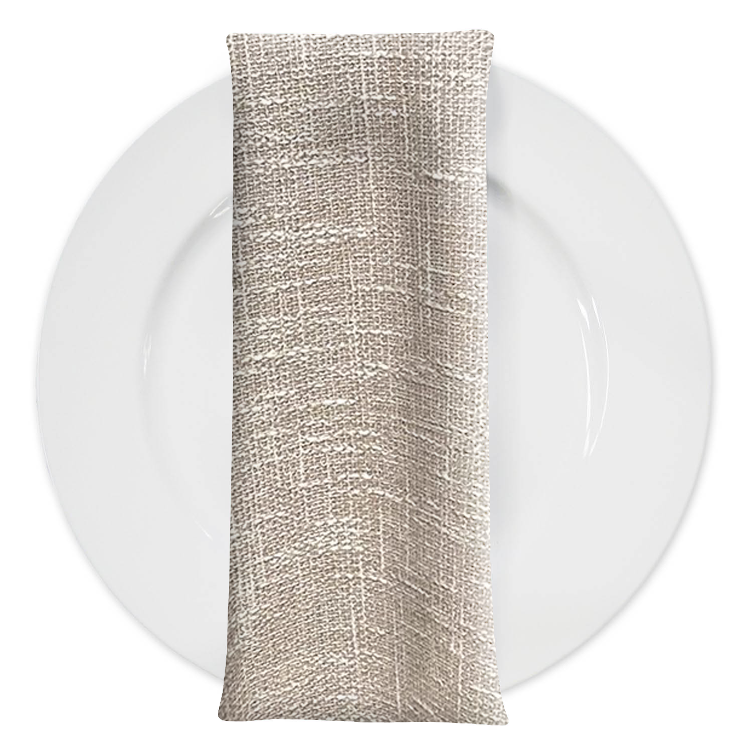 Fabric Collection: Our Capri Slub Linen has a soft linen finish with multi-tone slub lines to provide an elegant yet rustic ambiance to your event. This fabric is 100% polyester so it's durable and easy to care for. It's also double-wide so it's seamless in most linen sizes.