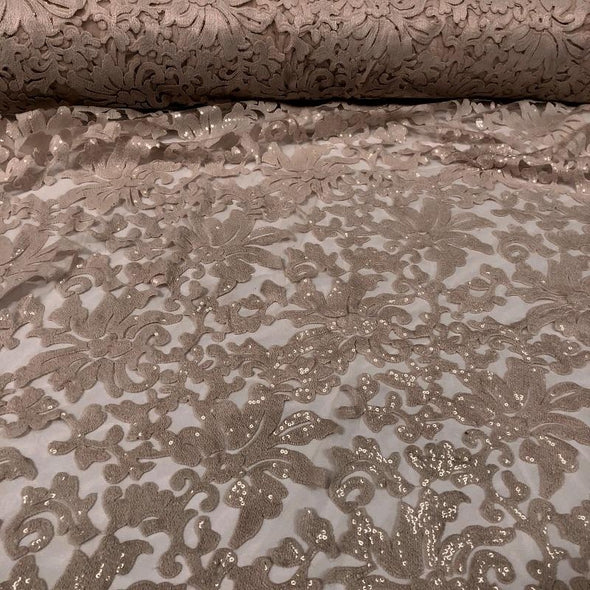 Fabric Collection: This material has a mesh/sheer base w/ sequins embroidery in our "Milan" design throughout the fabric.