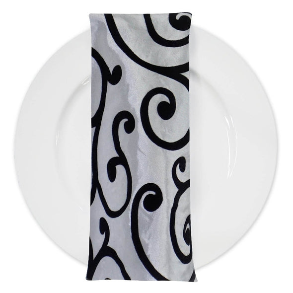 Swirl Flocking Taffeta Table Napkins in Black and Ivory