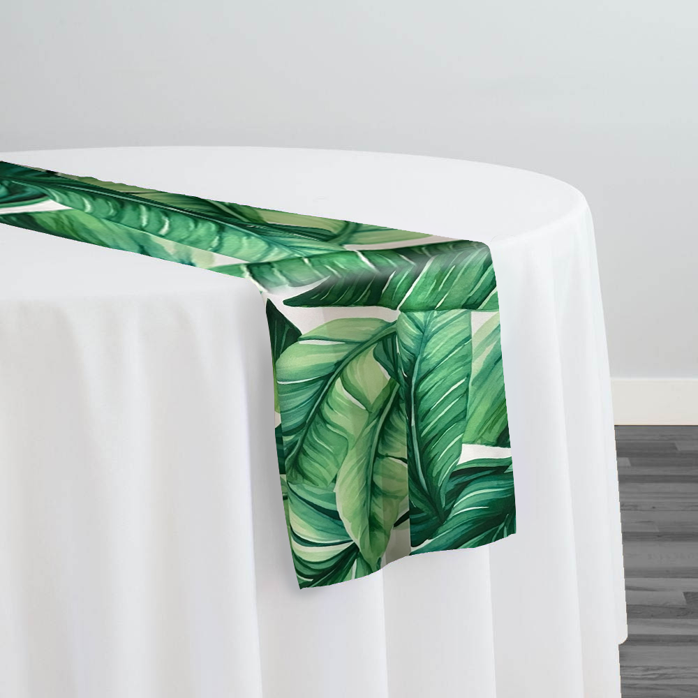 Our hunter-green table runners are available in an array of exquisite fabrics to suit any style and occasion. Choose from satin, known for its lustrous sheen and soft drape, or taffeta, which offers a crisp, structured look that adds a touch of sophistication. For those seeking a more textured option, our jacquard fabric features intricate woven patterns that enhance visual interest. If you prefer a lighter touch, our sheer runners create an airy, ethereal effect, perfect for layering. Additionally, our digital prints allow for unique designs that can match your specific theme, making these runners versatile for any event.