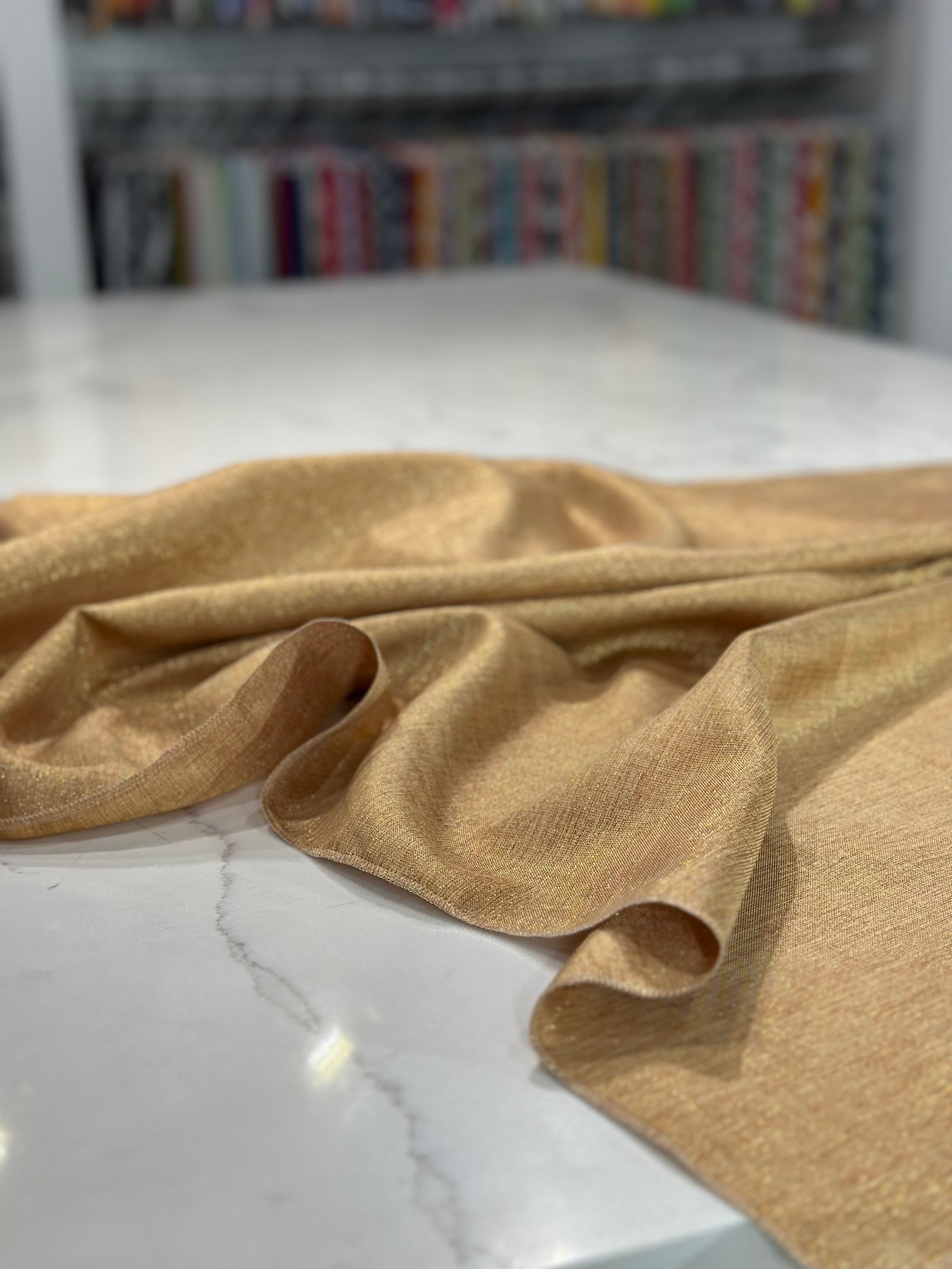 Fabric Collection: This fabric has a burlap texture/design throughout and is made from polyester so it's easy to care for. It also has metallic threading to give it an elegant upgrade vs the traditional burlap look - This fabric is in a Gold color with Gold metallic threading mixed in.