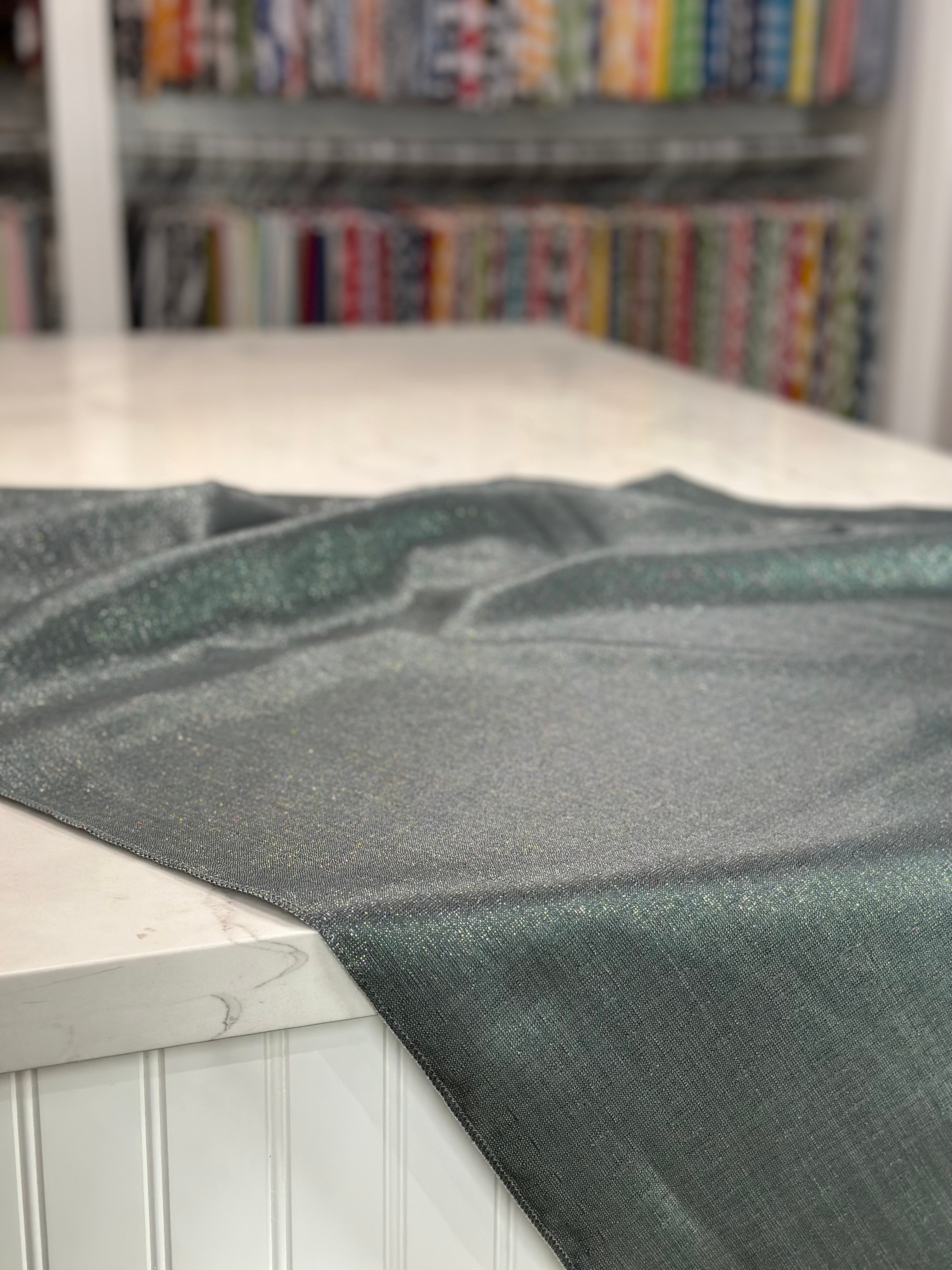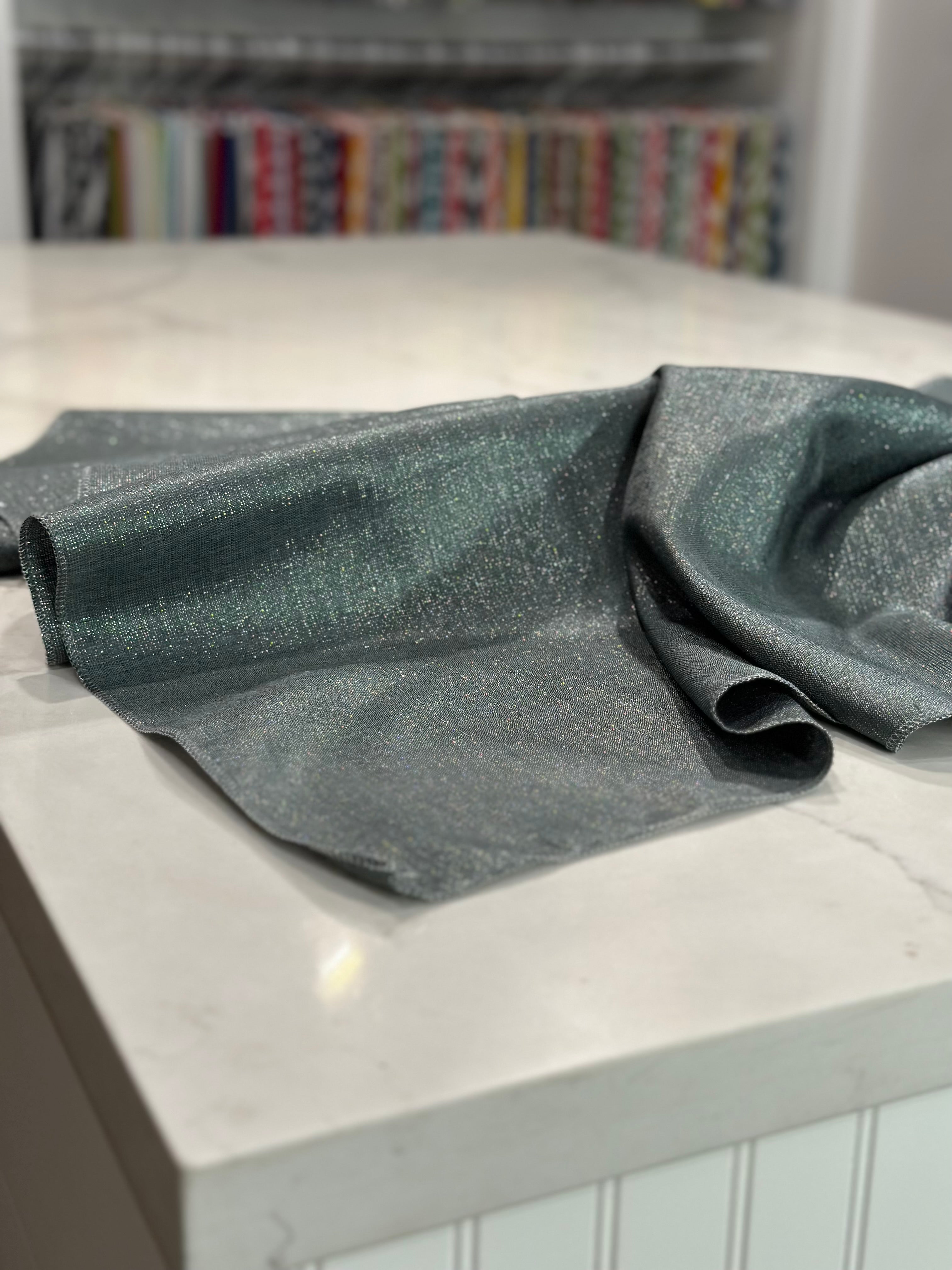 Fabric Collection: This fabric has a burlap texture/design throughout and is made from polyester so it's easy to care for. It also has metallic threading to give it an elegant upgrade vs the traditional burlap look - This fabric is in a gray color with silver metallic threading mixed in.