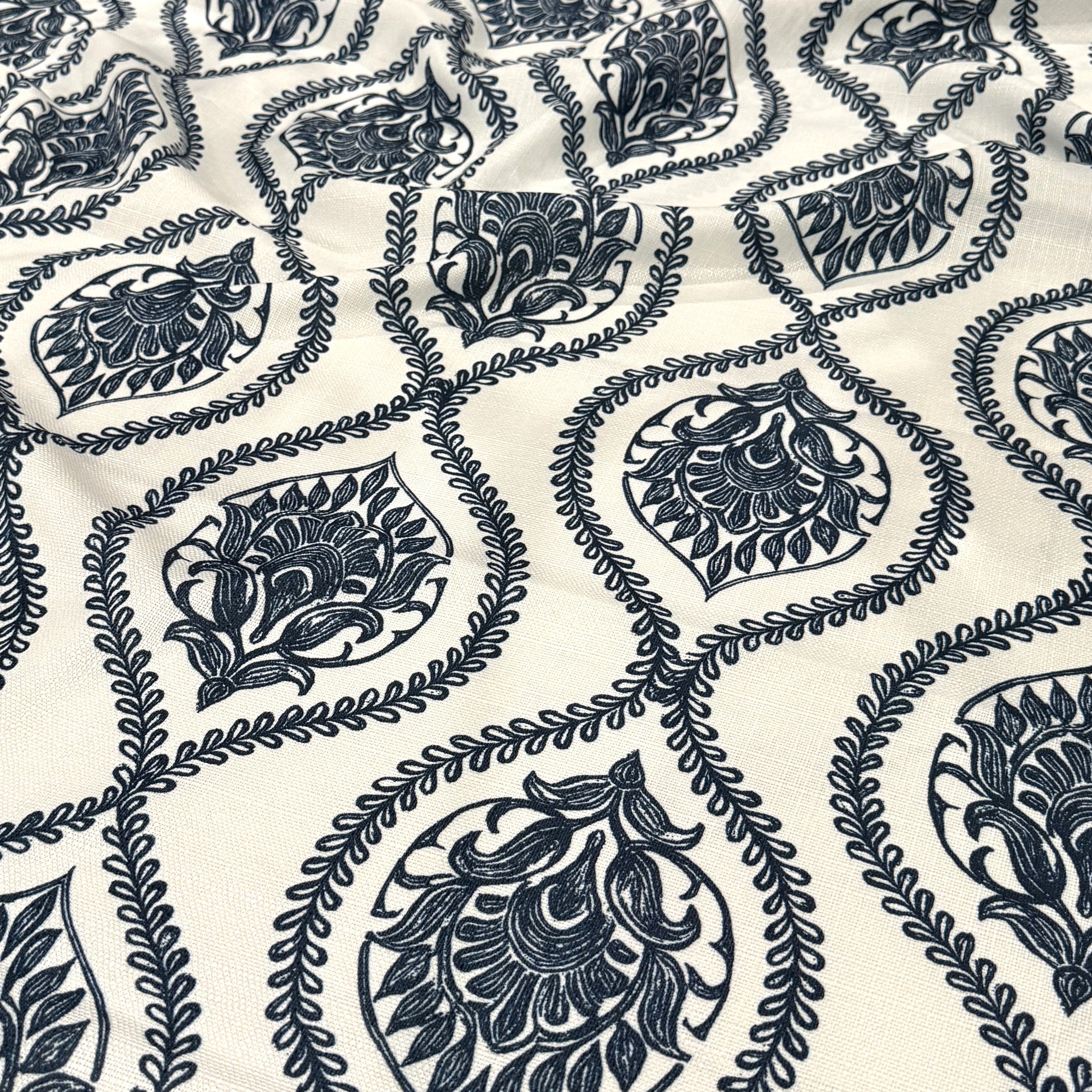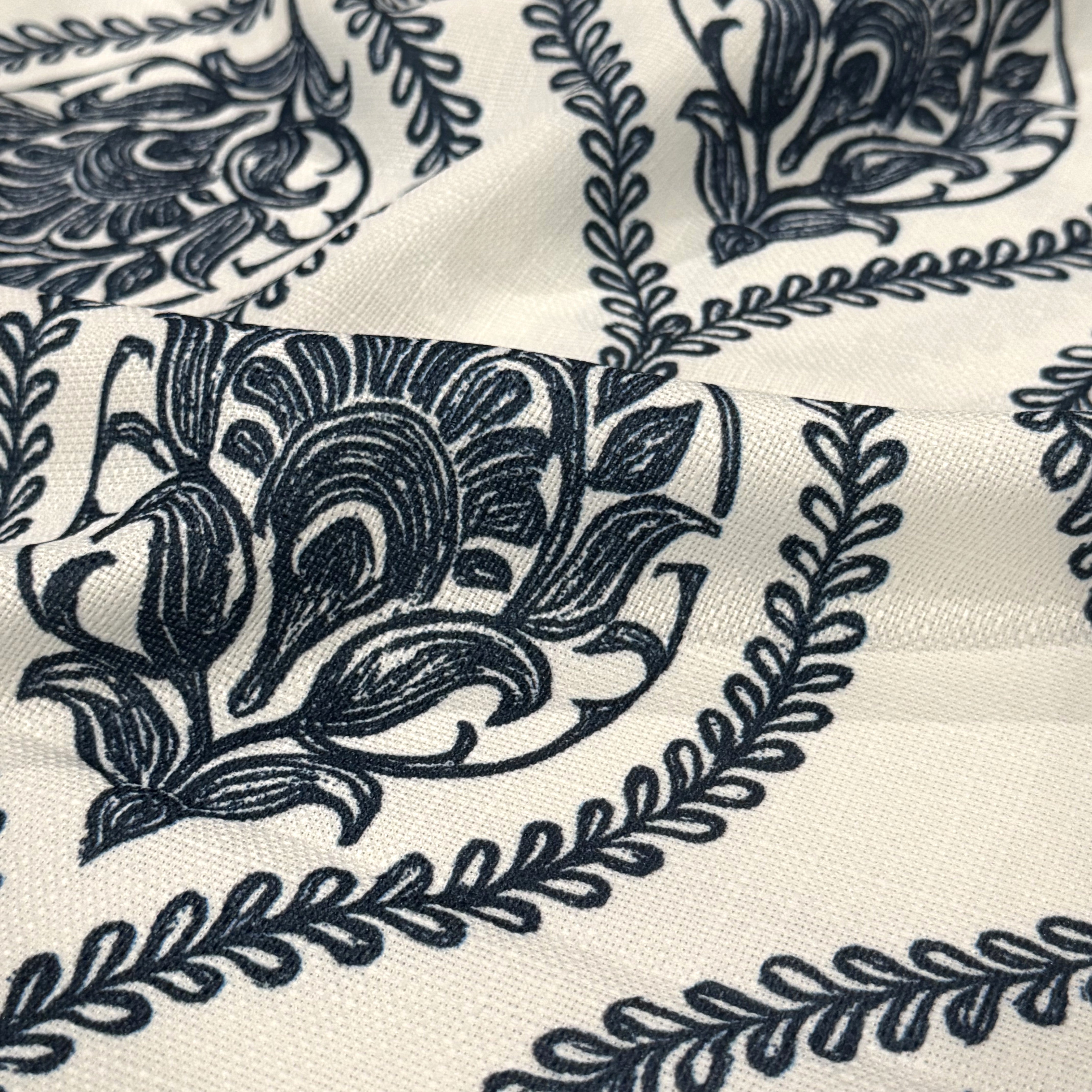 Fabric Collection: Mayfair (Slub Print) is a premium slubby, linen-inspired fabric featuring a refined ornamental pattern created through high-quality digital printing. The textured base provides a natural look and elegant drape, making it a sophisticated choice for elevated event décor.