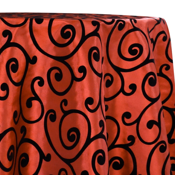 Swirl Flocking Taffeta Table Linen in Black on Orange