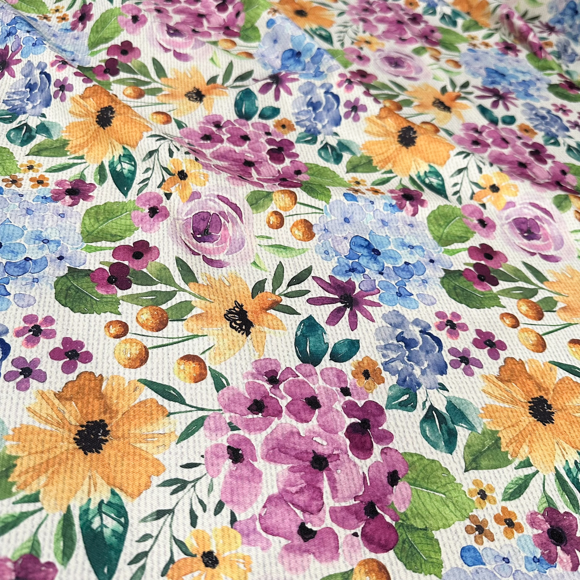This fabric is 100% polyester base with our "Summer Fields" print which has a multi-floral design with greenery accents throughout.