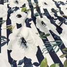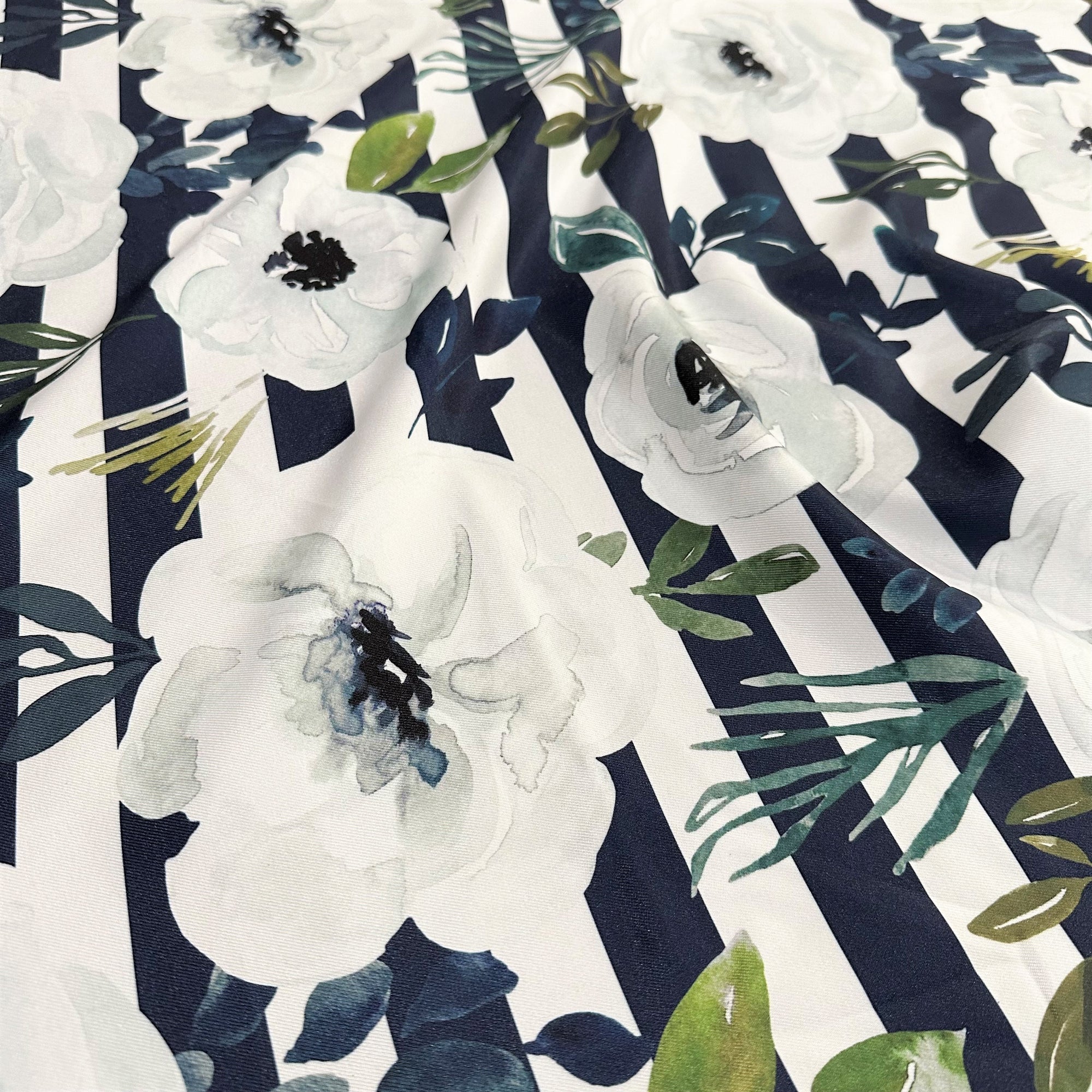 This fabric is 100% polyester base with our "Terra Bella" print which has a floral design with navy stripes on a White background throughout.