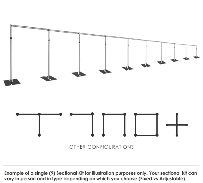 The 9-Section Pipe & Drape Kit is the largest and most versatile option, making it perfect for event planners, rental companies, and large-scale productions that require maximum coverage and a seamless setup!