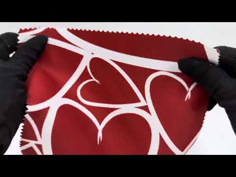 This fabric is a polyester base with different size hearts all throughout the fabric.