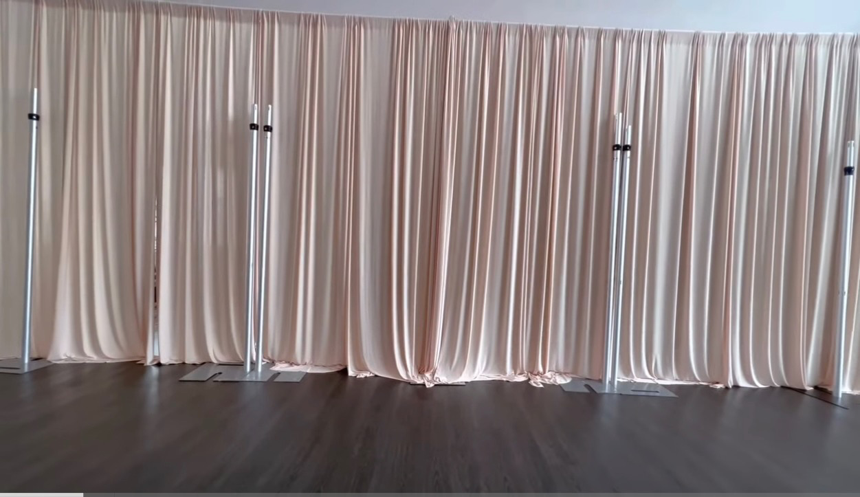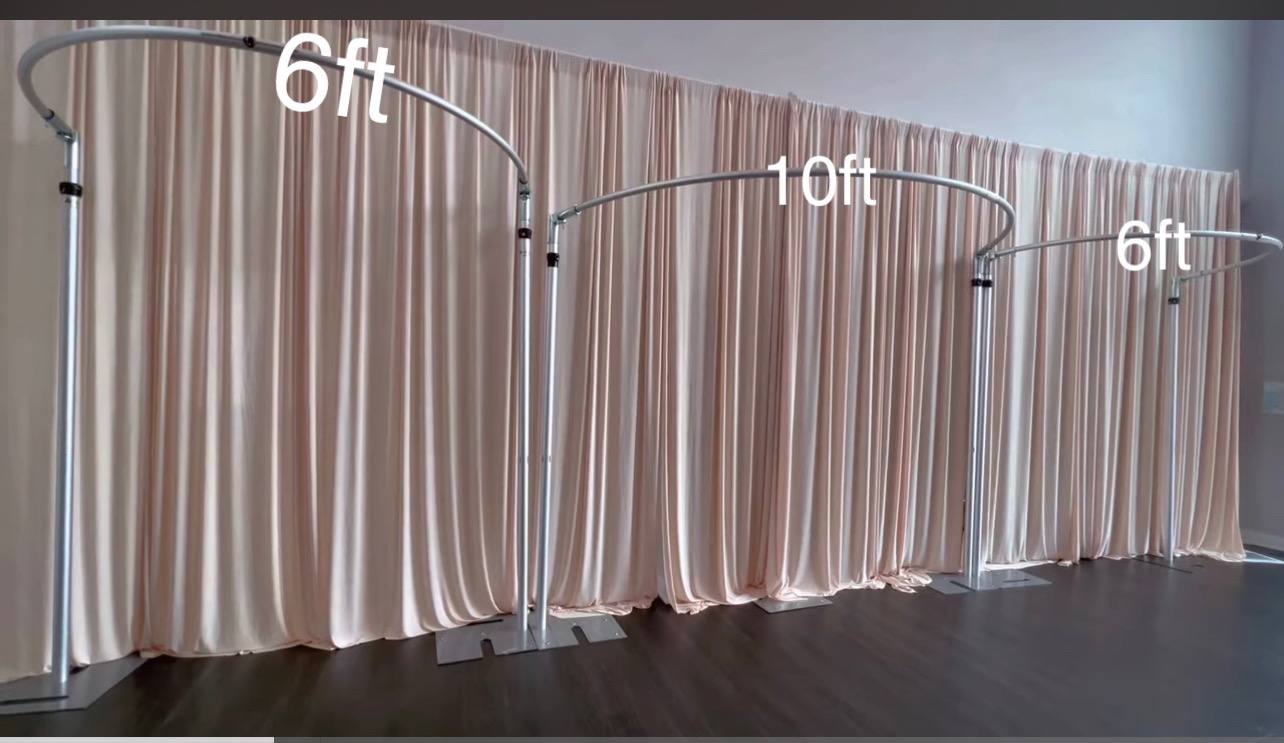This Triple Curved Backdrop Kit provides the hardware to build a stunning focal point for any special event. This build was designed by NooZay Decor, and her mastful work is on full display. Use this kit and NooZay's how-to video easily build your own modern backdrop. This kit offers all the high-quality Pipe & Drape hardware needed in one easy purchase. Also, don't forget to purchase the raw fabric or drapery panels to complete the look (see details below).