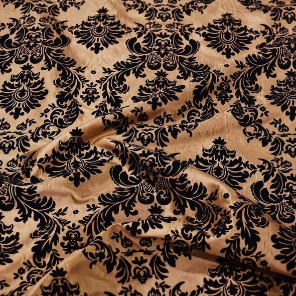 Damask Flocking Taffeta Wholesale Fabric in Black on Gold