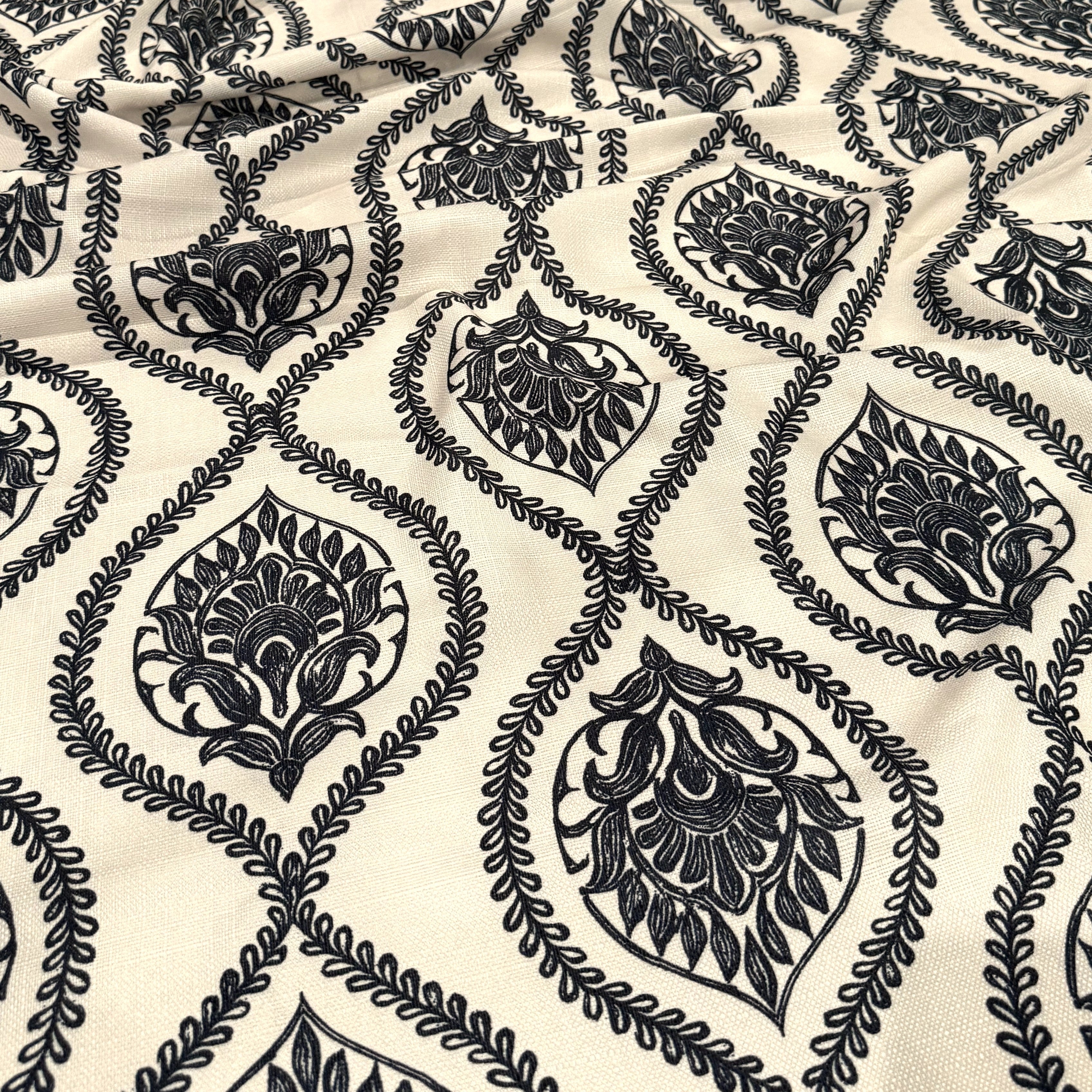 Fabric Collection: Mayfair (Slub Print) is a premium slubby, linen-inspired fabric featuring a refined ornamental pattern created through high-quality digital printing. The textured base provides a natural look and elegant drape, making it a sophisticated choice for elevated event décor.