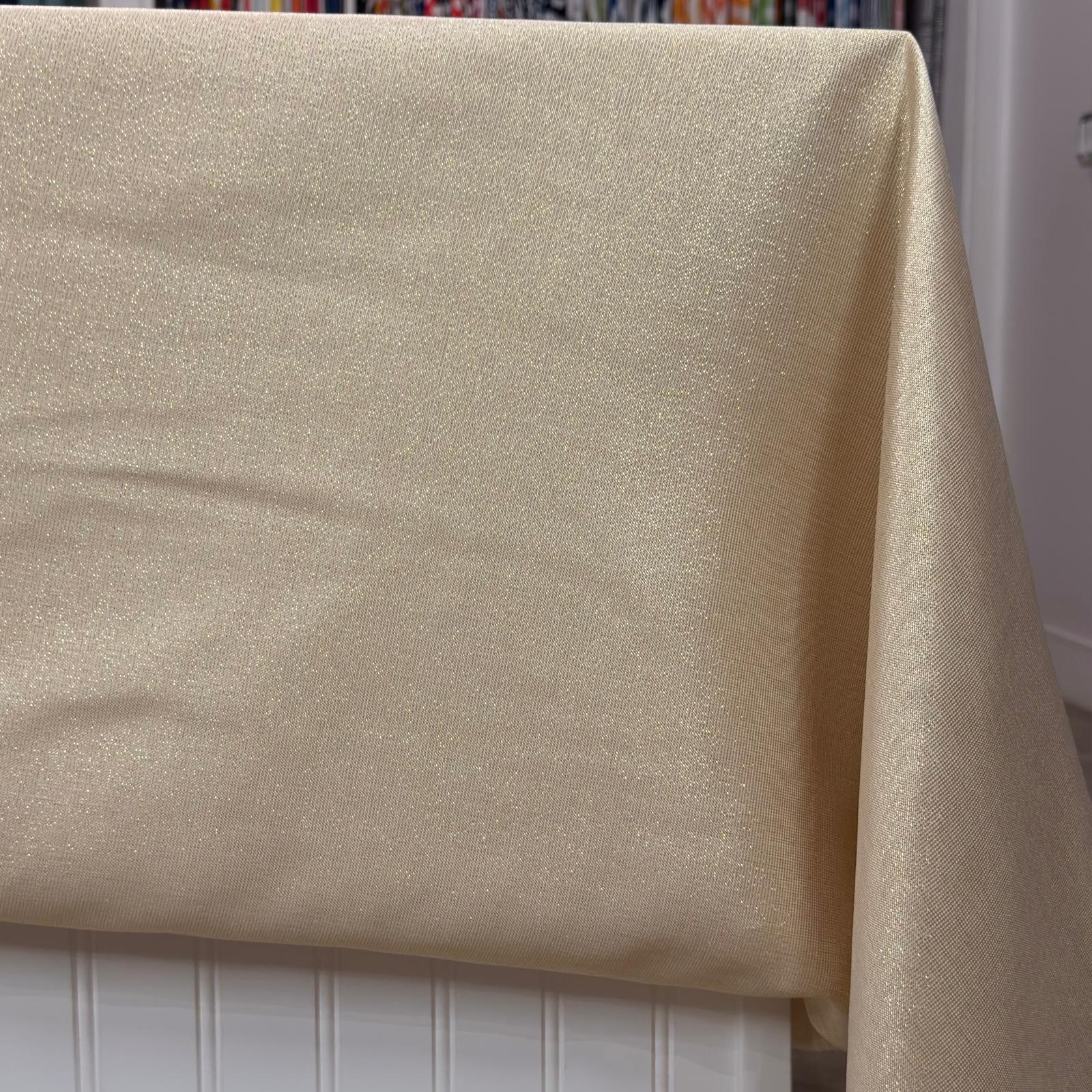 Fabric Collection: This fabric has a burlap texture/design throughout and is made from polyester so it's easy to care for. It also has metallic threading to give it an elegant upgrade vs the traditional burlap look - This fabric is in a beige color with gold metallic threading mixed in.