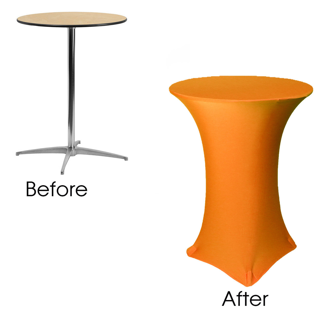 Our durable spandex chair covers fit standard 30"x42" Highboy/Cocktail Tables (30" Round x 42" Tall w/ 4 Leg Base). They're made from high quality spandex with a 4-way stretch so they're easy to put on and made to last. They're also made with durable elastic foot pockets which help secure the cover in place, ensure a great fit, and help prevent damage and excess wear and tear. These covers are a perfect way to improve the look of your chair covers and ideal for rental companies, banquet halls, hotels, various venues and special events.