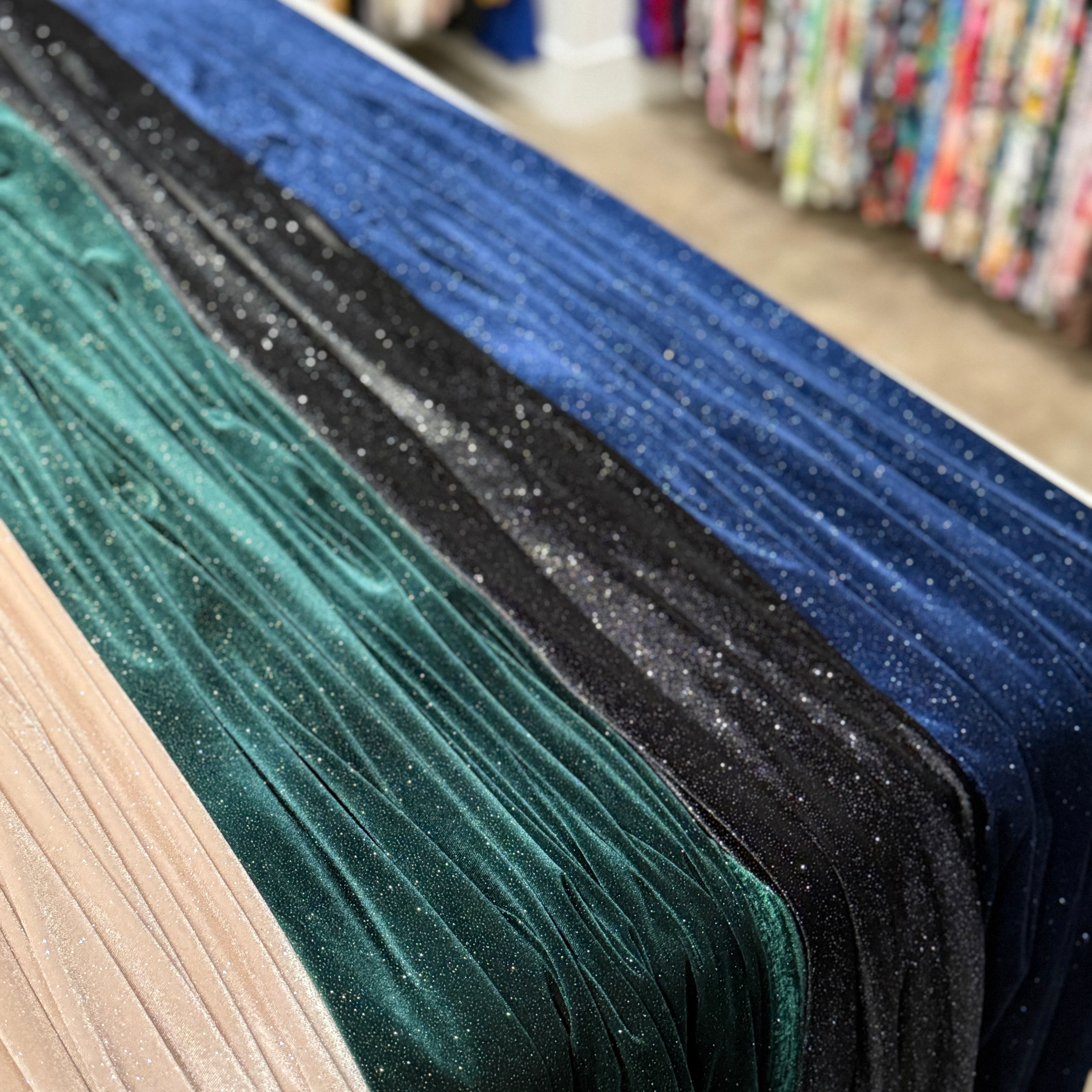 Fabric Collection: Elevate your special occasions with our luxurious Glitter Velour fabric! This stunning material combines the softness of velour with a dazzling glitter finish, creating an elegant and glamorous look. Ideal for crafting tablecloths, table runners, napkins, drapes, and more, it's the perfect choice for weddings, parties, and upscale events. Add a touch of sparkle to your décor with this versatile and show-stopping fabric!