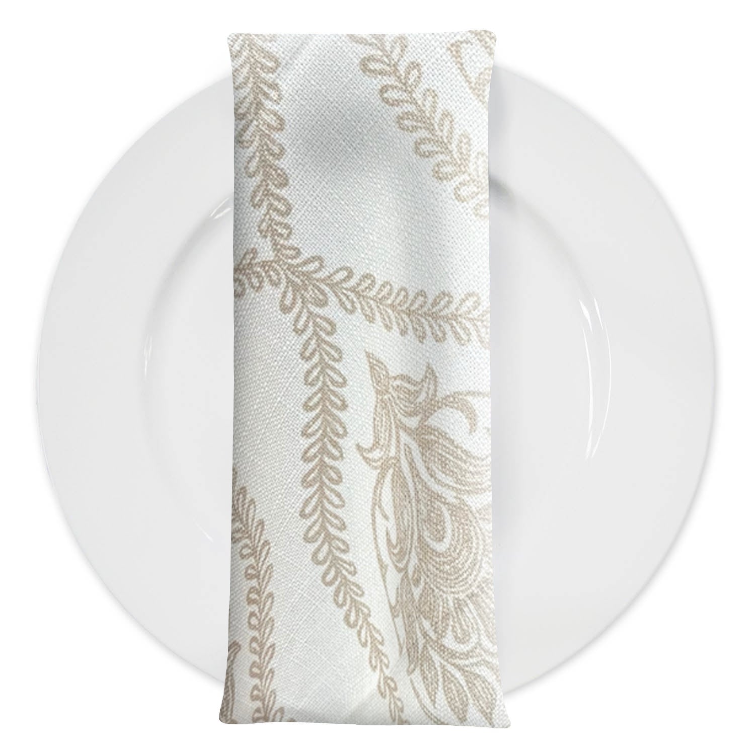 Fabric Collection: Mayfair (Slub Print) is a premium slubby, linen-inspired fabric featuring a refined ornamental pattern created through high-quality digital printing. The textured base provides a natural look and elegant drape, making it a sophisticated choice for elevated event décor.