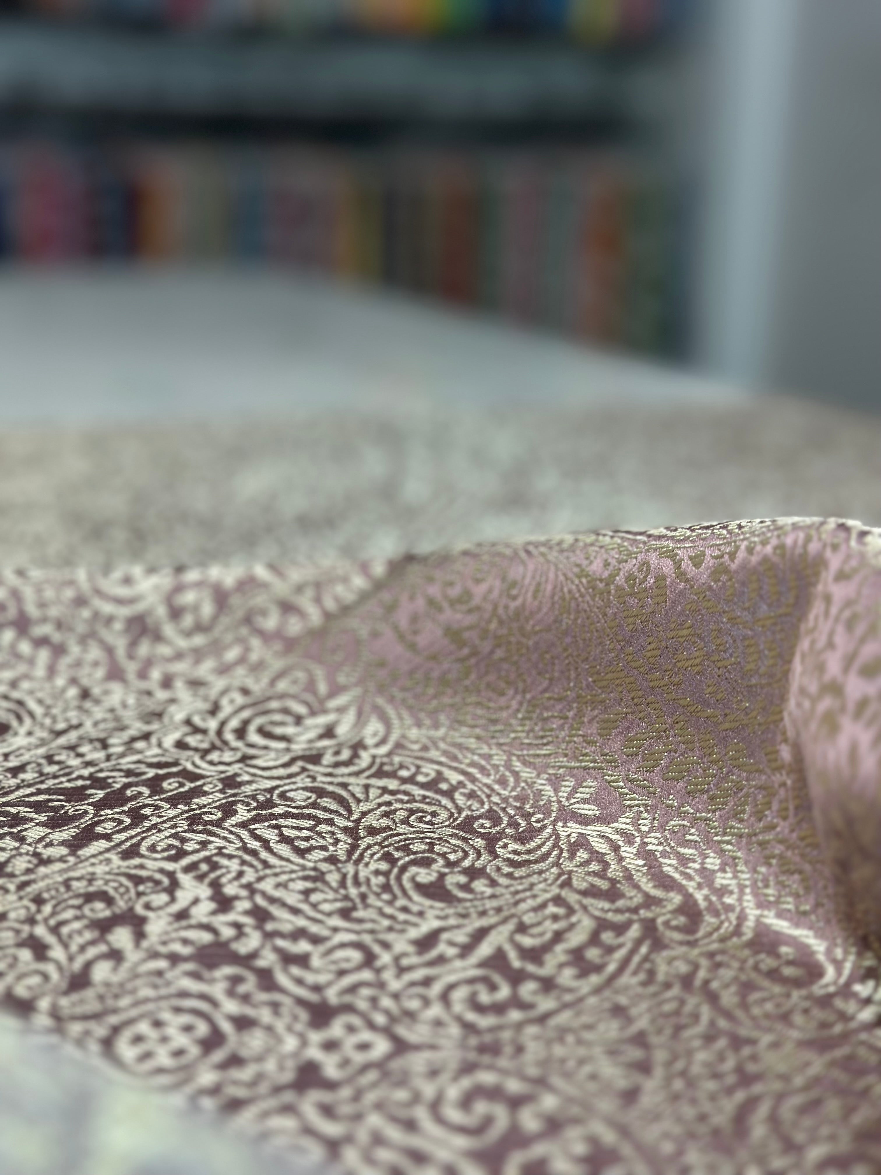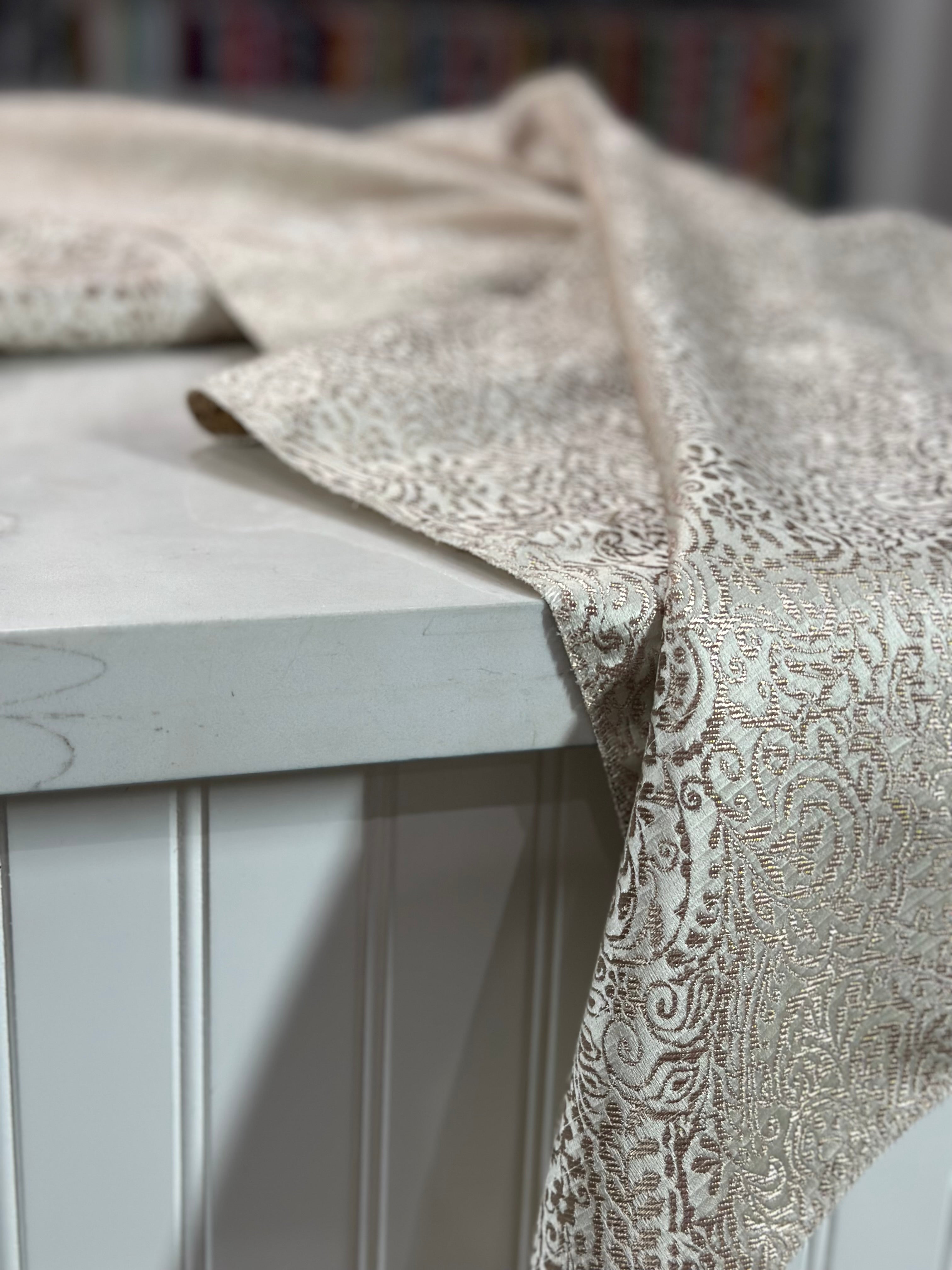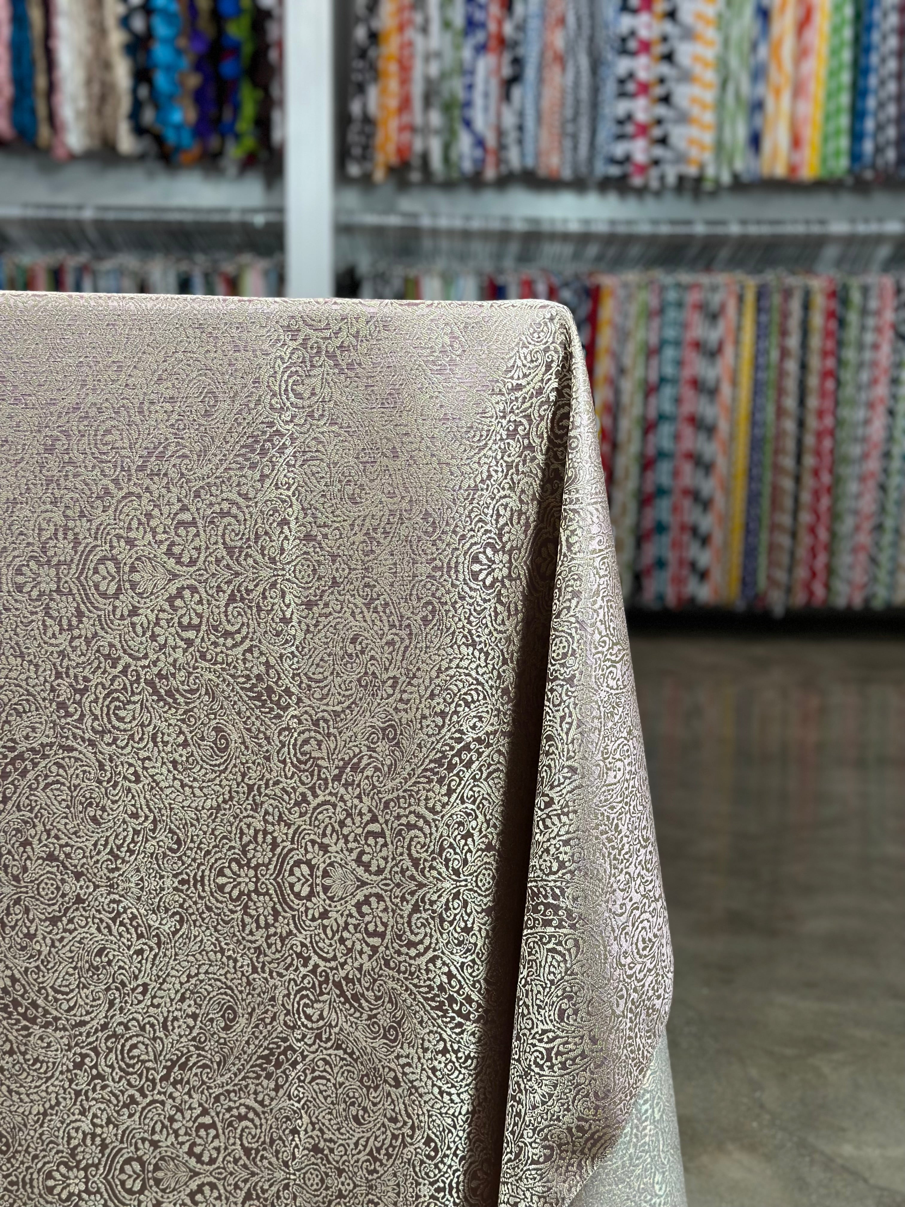Fabric Collection: This fabric is a Polyester base with metallic embroidered design and multi tone color throughout material.