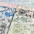 Fabric Collection: Our Artistry Bloom fabric offers a gorgeous toile de jouy vintage floral pattern on a white base. This stunning design is printed on a polyester fabric which also has a rustic slub-like textured finish.