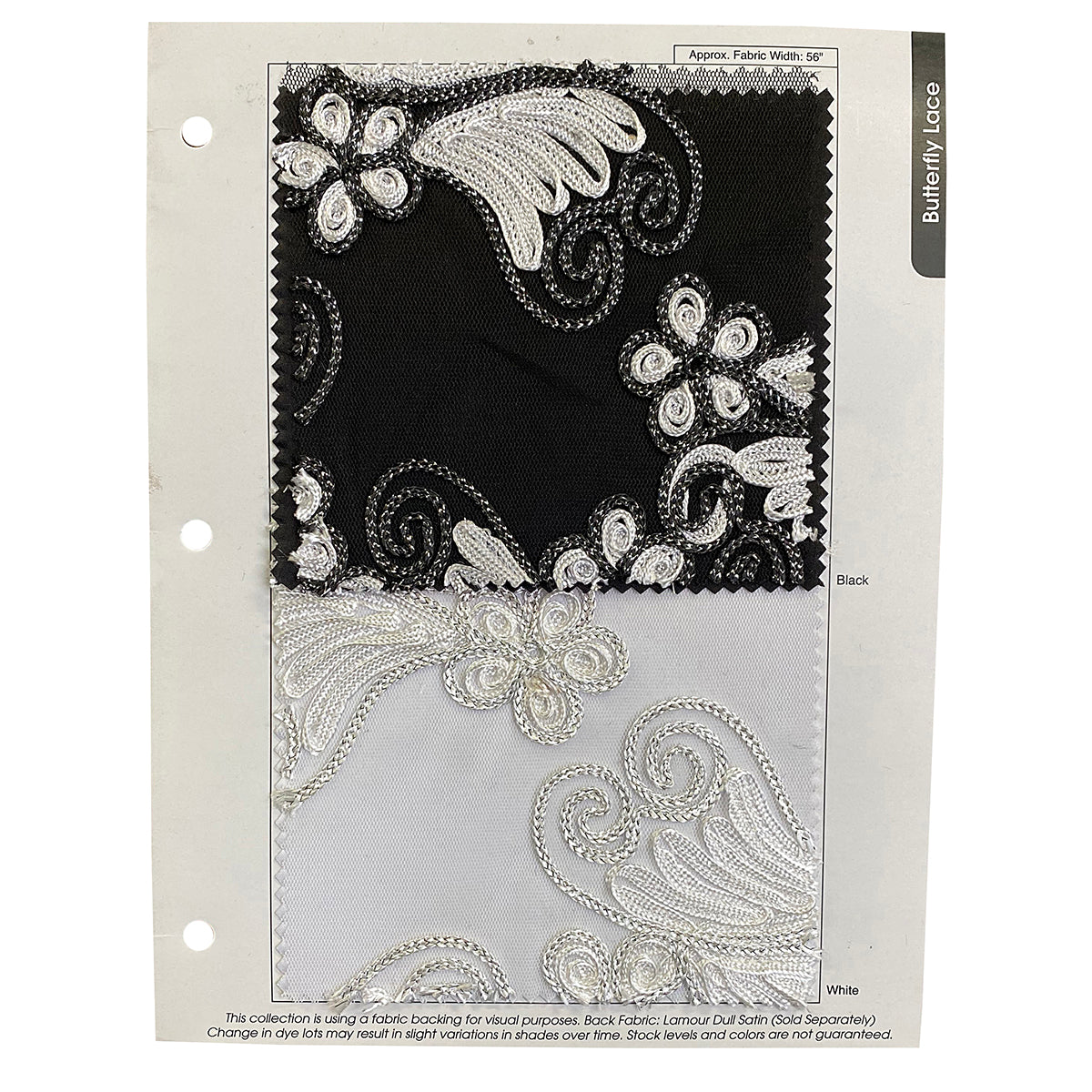 Fabric Collection: This material has a mesh base w/ a unique "butterfly" embroidered design throughout.