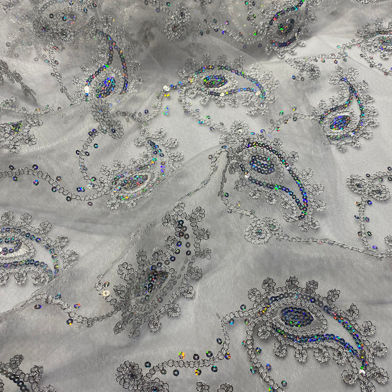 Fabric Collection: This fabric has a mesh netting base w/ a Paisley design embroidery with sequins throughout.