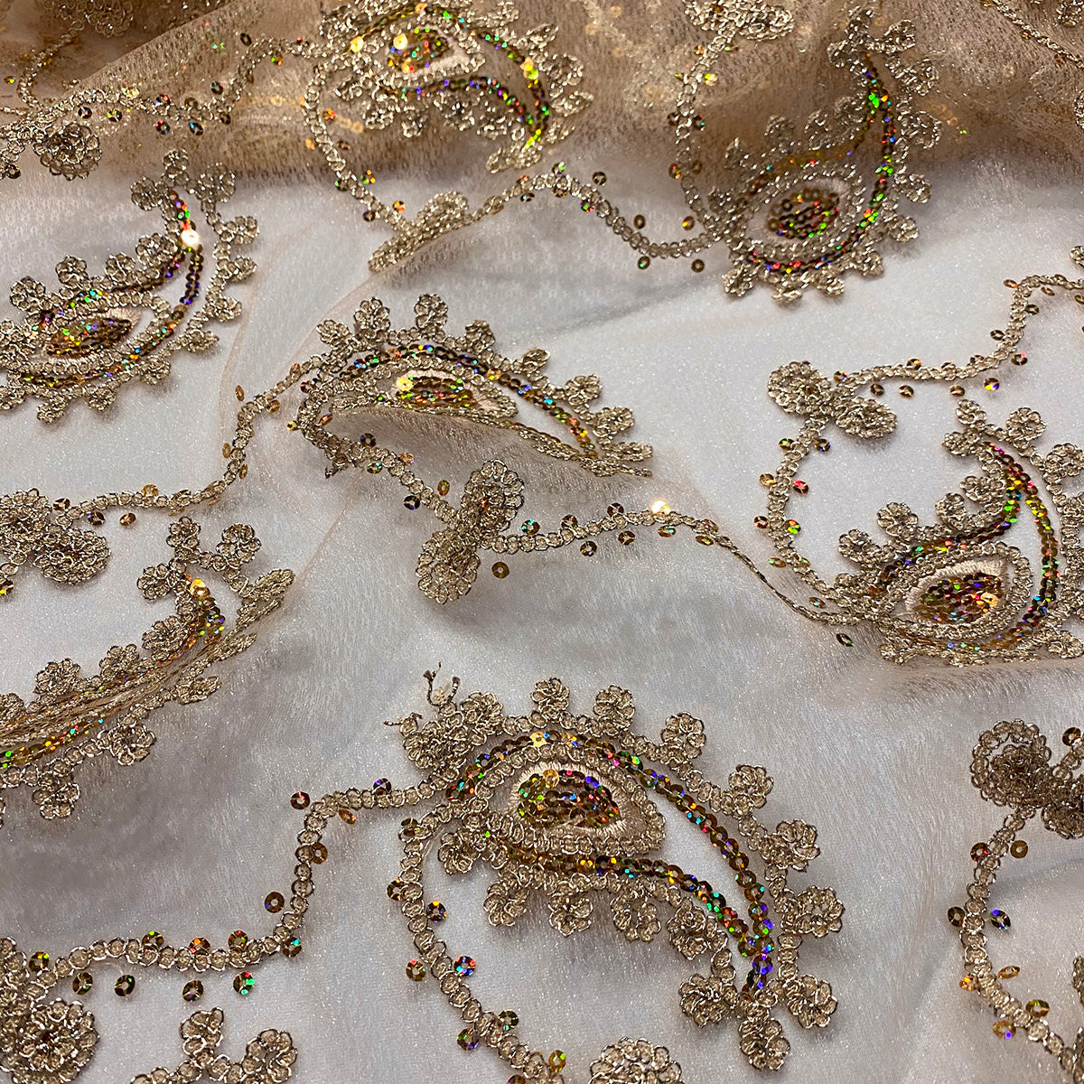 Fabric Collection: This fabric has a mesh netting base w/ a Paisley design embroidery with sequins throughout.