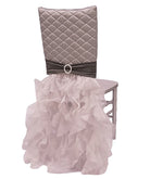FABRIC INFORMATION: Diamond tufted chair back w/ silver organza ruffles and charcoal chair band w/ rhinestone buckle.