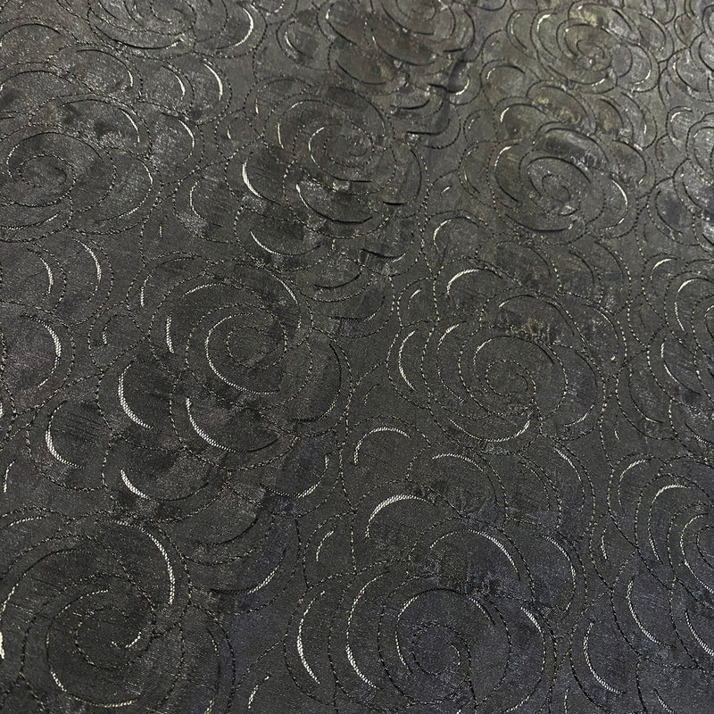 Fabric Collection: This fabric has a mesh base with a satin top that has a floral embroidered design. The floral petals have open flaps which offers a beautiful and unique look.