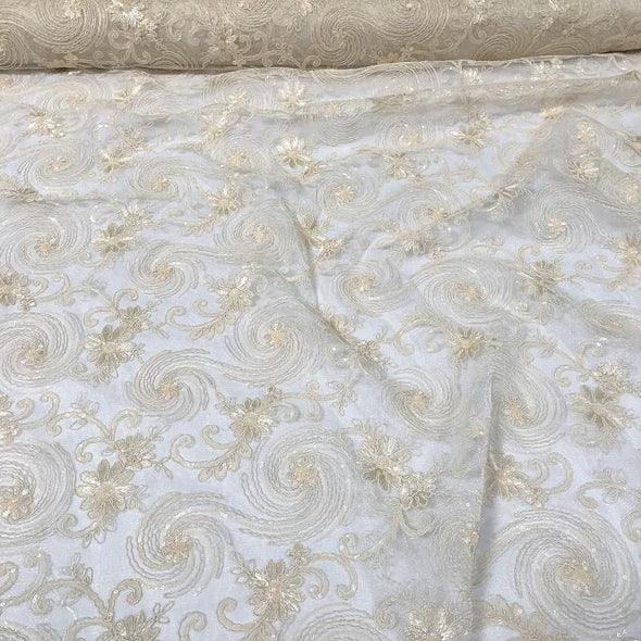 Fabric Collection: This material has a mesh/sheer base w/ sequins embroidery throughout the fabric in a swirl and floral design.