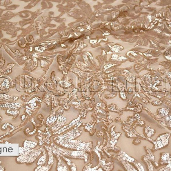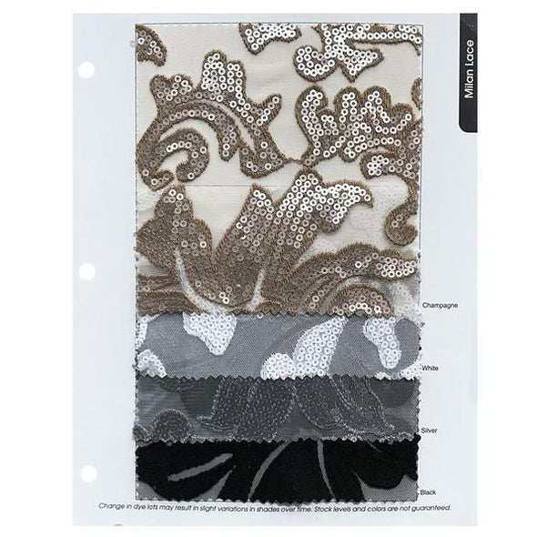 Fabric Collection: This material has a mesh/sheer base w/ sequins embroidery in our "Milan" design throughout the fabric.
