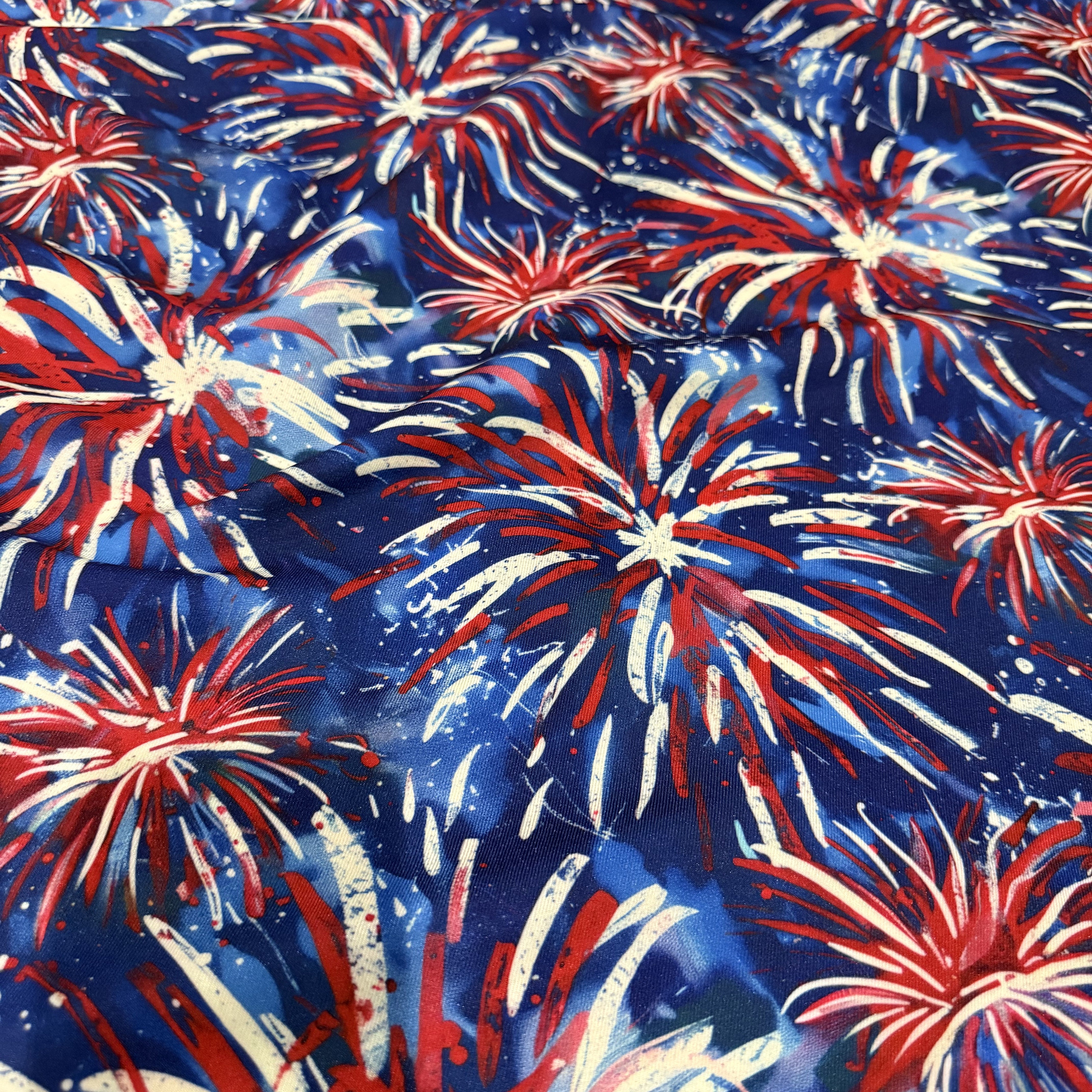 Ignite your celebrations with this bold fireworks-patterned fabric, perfect for tablecloths, runners, napkins, and drapes. Featuring a vibrant patriotic red, white, and blue color scheme - it’s ideal for patriotic holidays, events, parties, and festive gatherings.