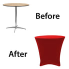 Our durable spandex chair covers fit standard 30"x30" Lowboy Tables (30" Round x 30" Tall w/ 4 Leg Base). They're made from high quality spandex with a 4-way stretch so they're easy to put on and made to last. They're also made with durable elastic foot pockets which help secure the cover in place, ensure a great fit, and help prevent damage and excess wear and tear. These covers are a perfect way to improve the look of your chair covers and ideal for rental companies, banquet halls, hotels, various venues and special events.