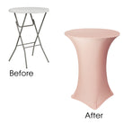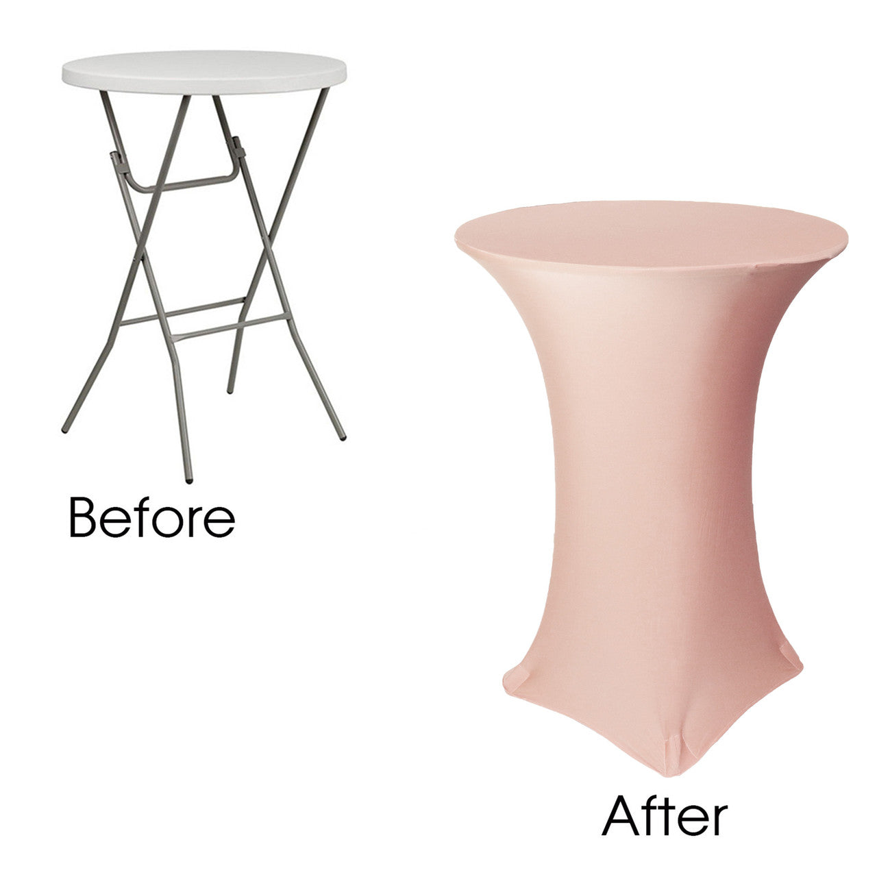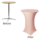 Our durable spandex chair covers fit standard 30"x42" Highboy/Cocktail Tables (30" Round x 42" Tall w/ 4 Leg Base). They're made from high quality spandex with a 4-way stretch so they're easy to put on and made to last. They're also made with durable elastic foot pockets which help secure the cover in place, ensure a great fit, and help prevent damage and excess wear and tear. These covers are a perfect way to improve the look of your chair covers and ideal for rental companies, banquet halls, hotels, various venues and special events.