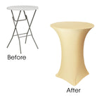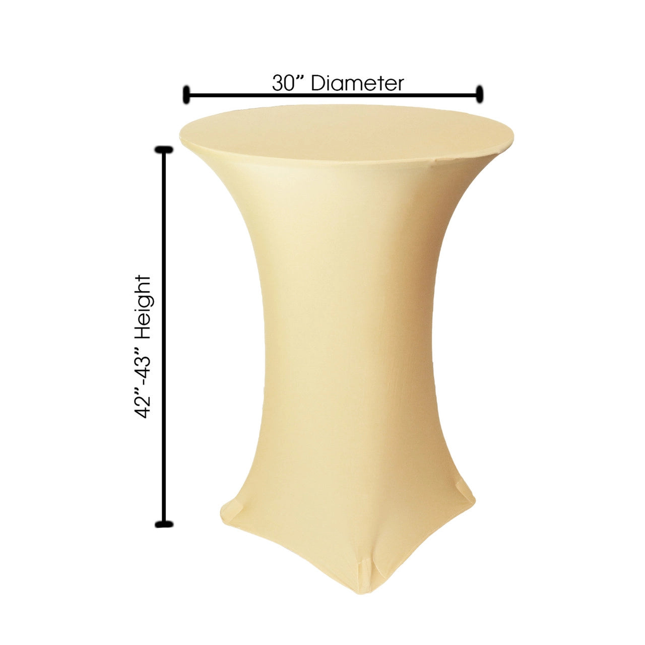 Our durable spandex chair covers fit standard 30"x42" Highboy/Cocktail Tables (30" Round x 42" Tall w/ 4 Leg Base). They're made from high quality spandex with a 4-way stretch so they're easy to put on and made to last. They're also made with durable elastic foot pockets which help secure the cover in place, ensure a great fit, and help prevent damage and excess wear and tear. These covers are a perfect way to improve the look of your chair covers and ideal for rental companies, banquet halls, hotels, various venues and special events.