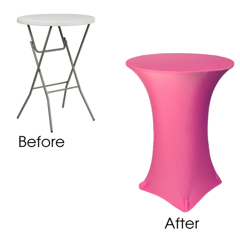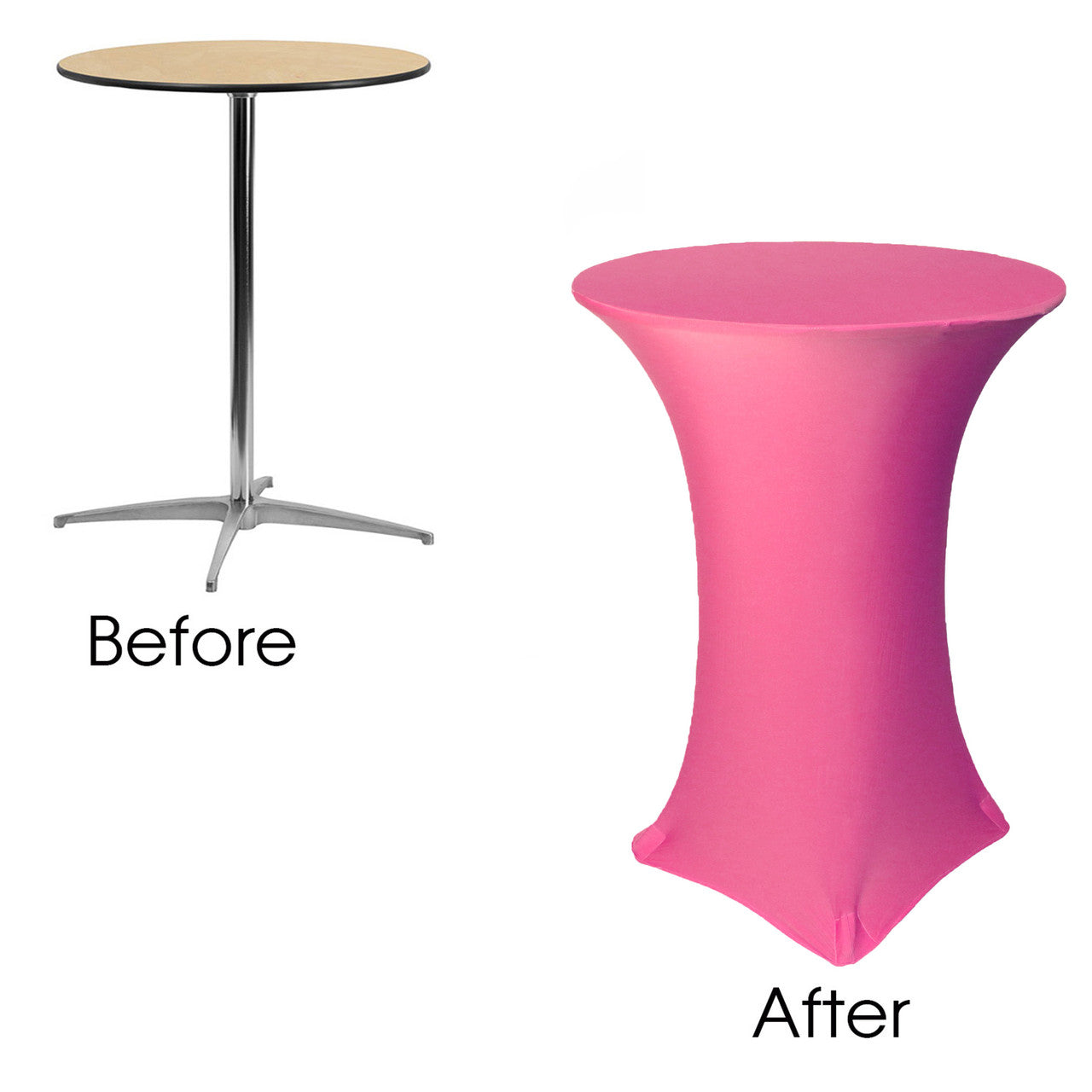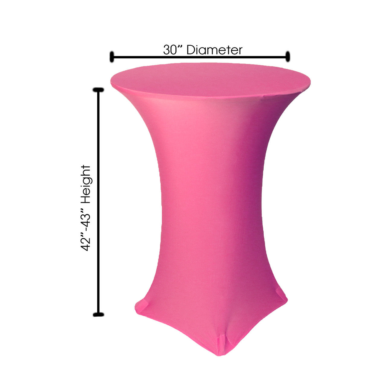 Our durable spandex chair covers fit standard 30"x42" Highboy/Cocktail Tables (30" Round x 42" Tall w/ 4 Leg Base). They're made from high quality spandex with a 4-way stretch so they're easy to put on and made to last. They're also made with durable elastic foot pockets which help secure the cover in place, ensure a great fit, and help prevent damage and excess wear and tear. These covers are a perfect way to improve the look of your chair covers and ideal for rental companies, banquet halls, hotels, various venues and special events.