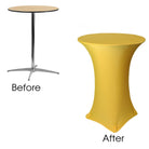 Our durable spandex chair covers fit standard 36"x42" Highboy Tables (36" Round x 42" Tall w/ 4 Leg Base). They're made from high quality spandex with a 4-way stretch so they're easy to put on and made to last. They're also made with durable elastic foot pockets which help secure the cover in place, ensure a great fit, and help prevent damage and excess wear and tear. These covers are a perfect way to improve the look of your chair covers and ideal for rental companies, banquet halls, hotels, various venues and special events.