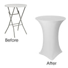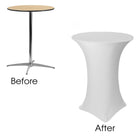 Our durable spandex chair covers fit standard 36"x42" Highboy Tables (36" Round x 42" Tall w/ 4 Leg Base). They're made from high quality spandex with a 4-way stretch so they're easy to put on and made to last. They're also made with durable elastic foot pockets which help secure the cover in place, ensure a great fit, and help prevent damage and excess wear and tear. These covers are a perfect way to improve the look of your chair covers and ideal for rental companies, banquet halls, hotels, various venues and special events.