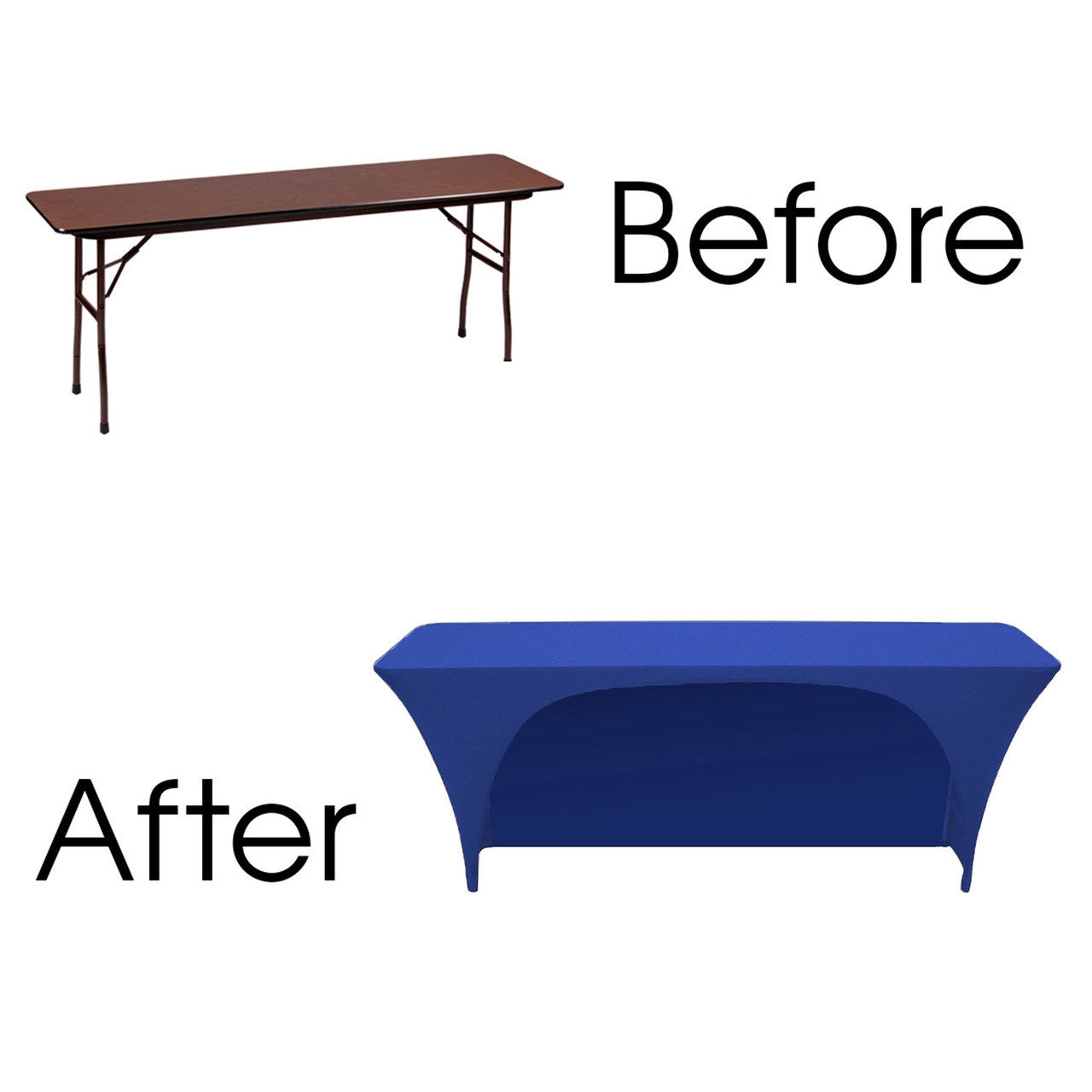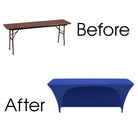 Our durable spandex chair covers fit classroom 6' Banquet Tables (6' Length x 18" Depth x 30" Tall) and they have one side open allowing for chairs to be used on that side. They're made from high quality spandex with a 4-way stretch so they're easy to put on and made to last. They're also made with durable elastic foot pockets which help secure the cover in place, ensure a great fit, and help prevent damage and excess wear and tear. These covers are a perfect way to improve the look of your chair covers and ideal for rental companies, banquet halls, hotels, various venues and special events.