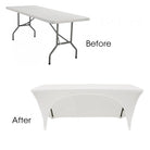 Our durable spandex chair covers fit standard 6' Banquet Tables (6' Length x 30" Depth x 30" Tall) and they have one side open allowing for chairs to be used on that side. They're made from high quality spandex with a 4-way stretch so they're easy to put on and made to last. They're also made with durable elastic foot pockets which help secure the cover in place, ensure a great fit, and help prevent damage and excess wear and tear. These covers are a perfect way to improve the look of your chair covers and ideal for rental companies, banquet halls, hotels, various venues and special events.