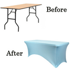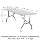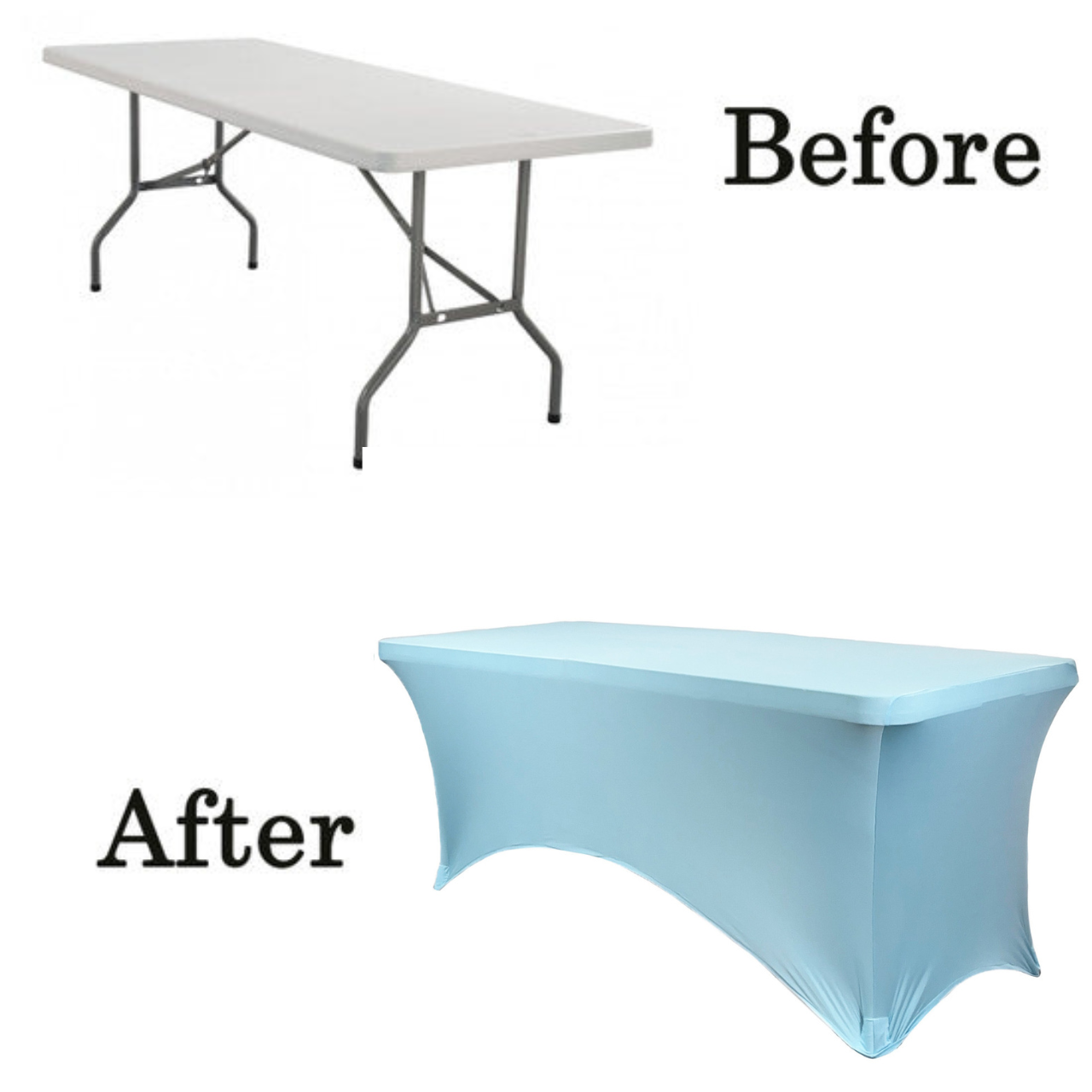 Our durable spandex chair covers fit standard 8' Banquet Tables (8' Length x 30" Depth x 30" Tall). They're made from high quality spandex with a 4-way stretch so they're easy to put on and made to last. They're also made with durable elastic foot pockets which help secure the cover in place, ensure a great fit, and help prevent damage and excess wear and tear. These covers are a perfect way to improve the look of your chair covers and ideal for rental companies, banquet halls, hotels, various venues and special events.