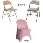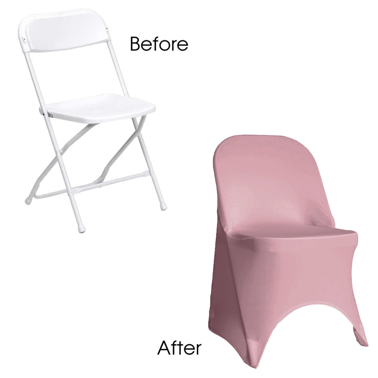 Our durable spandex chair covers fit almost all industry standard folding chairs. They're made from high quality spandex with a 4-way stretch so they're easy to put on and made to last. They're also made with durable elastic foot pockets which help secure the cover in place, ensure a great fit, and help prevent damage and excess wear and tear. These covers are a perfect way to improve the look of your chair covers and ideal for rental companies, banquet halls, hotels, various venues and special events.