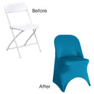 Our durable spandex chair covers fit almost all industry standard folding chairs. They're made from high quality spandex with a 4-way stretch so they're easy to put on and made to last. They're also made with durable elastic foot pockets which help secure the cover in place, ensure a great fit, and help prevent damage and excess wear and tear. These covers are a perfect way to improve the look of your chair covers and ideal for rental companies, banquet halls, hotels, various venues and special events.
