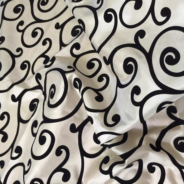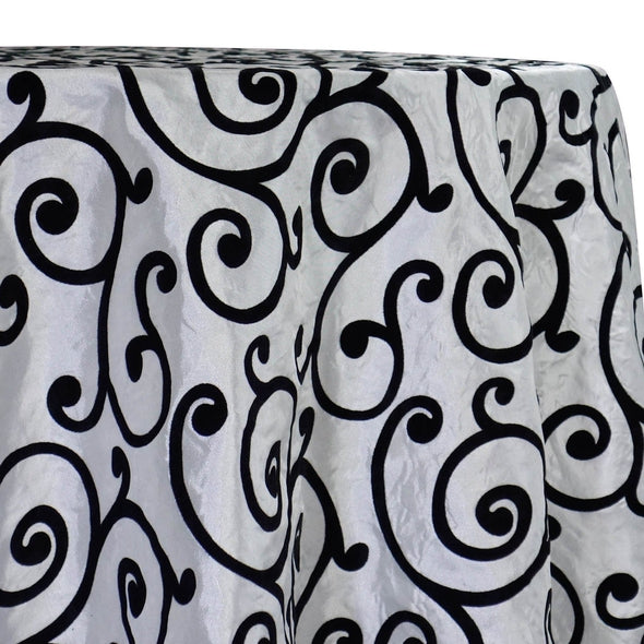 Swirl Flocking Taffeta Table Linen in Black on Ivory